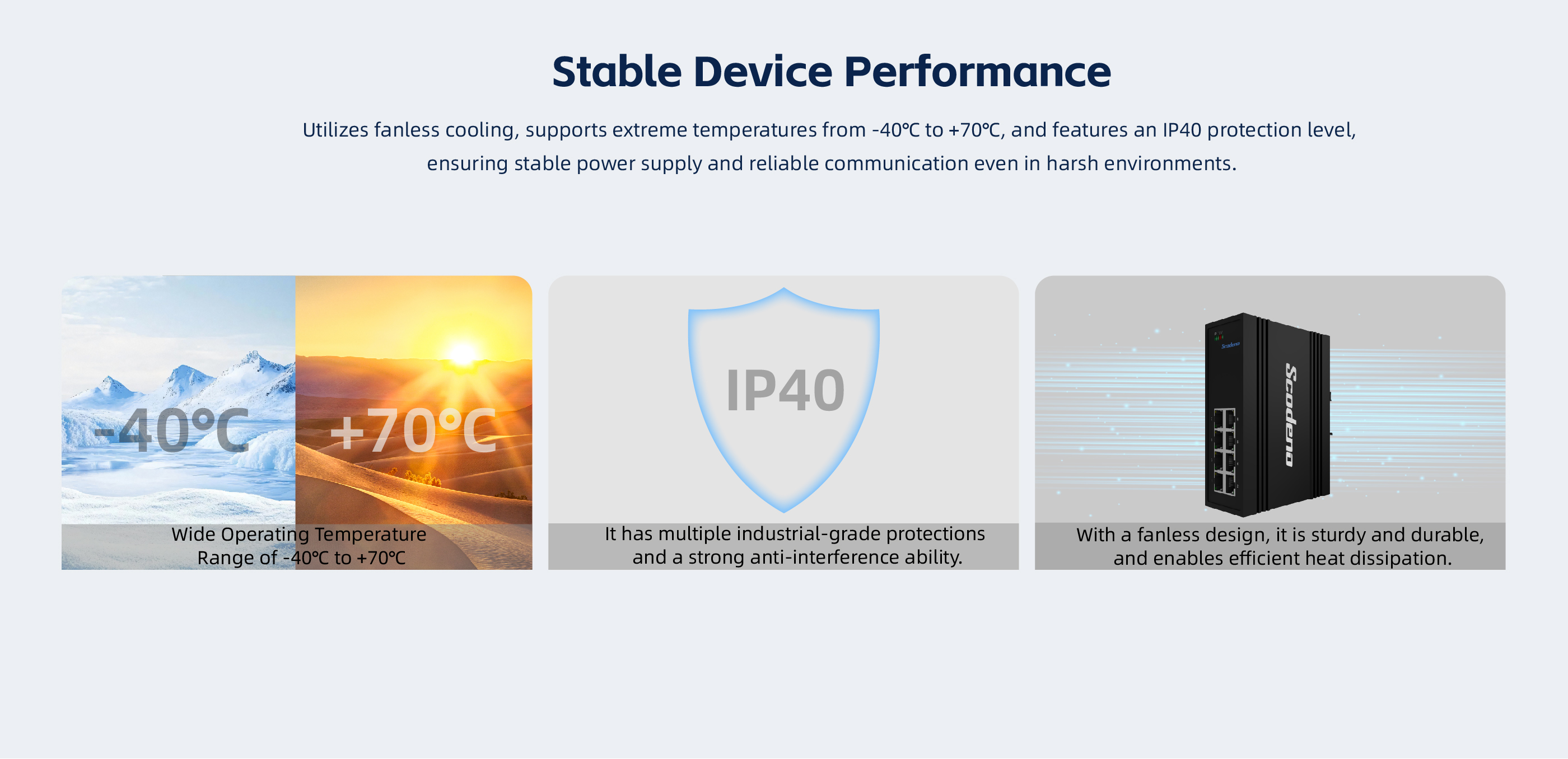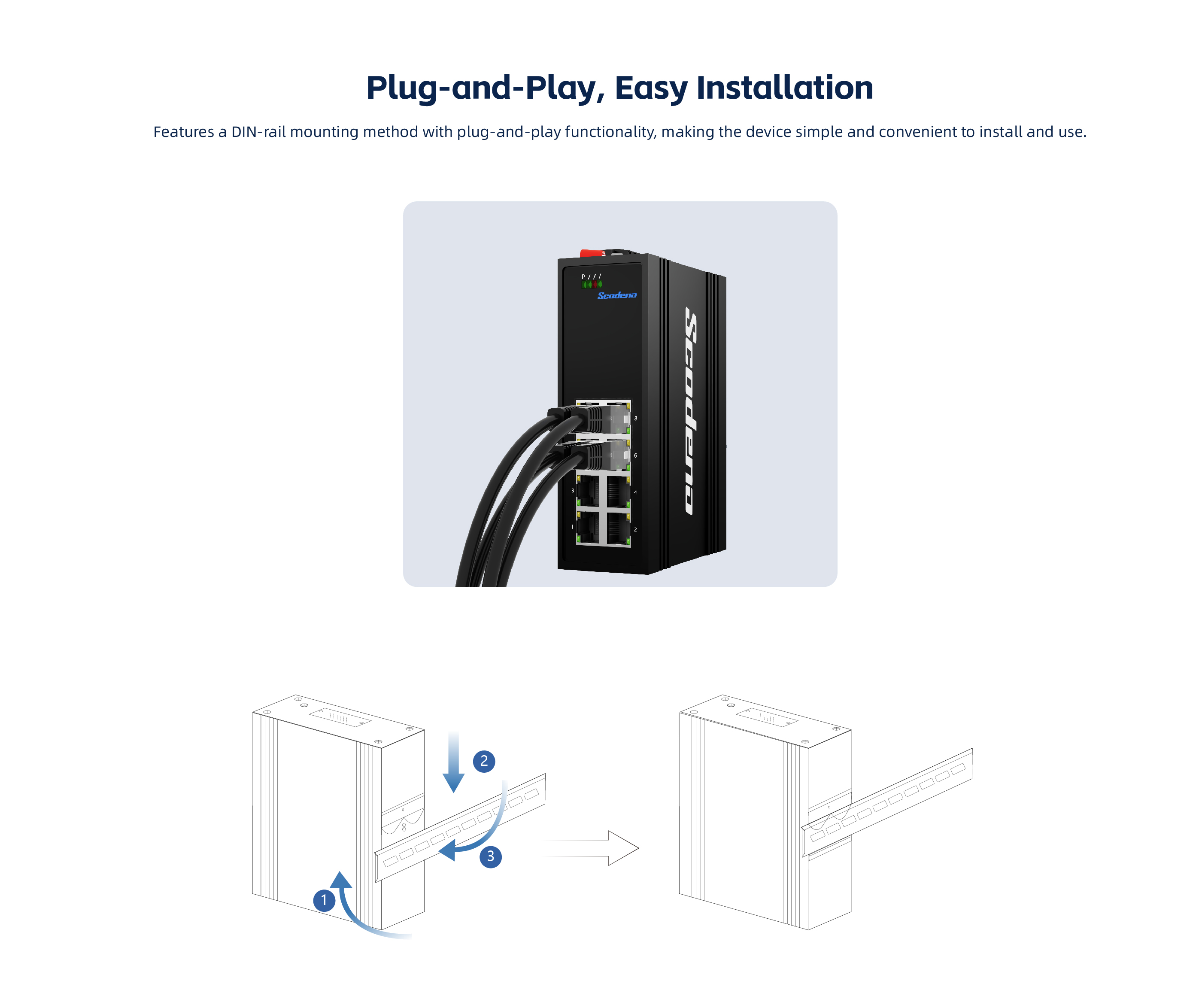 This device is an industrial Ethernet fast switch with 8 10/100M adaptive Ethernet ports, with optional POE. Through fanless cooling circuit design, wide range working environment temperature, high protection level and other technologies, it provides excellent industrial grade quality such as high/low temperature resistance and lightning protection, enhancing the reliability and security of industrial networks. It can better meet the deployment requirements of rail transit, safe cities, intelligent transportation, outdoor monitoring, and other harsh environments.