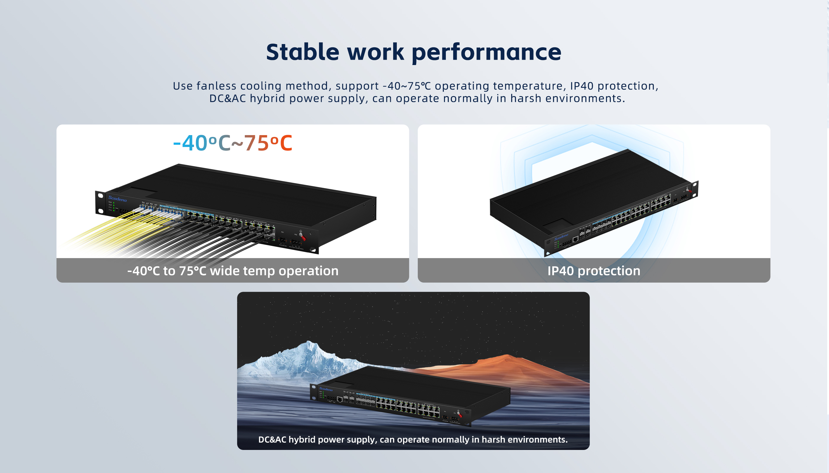 lOperating temperature range of -40℃ to +75℃, IP40 protection rating, featuring wide temperature tolerance and high protection for harsh environments.
