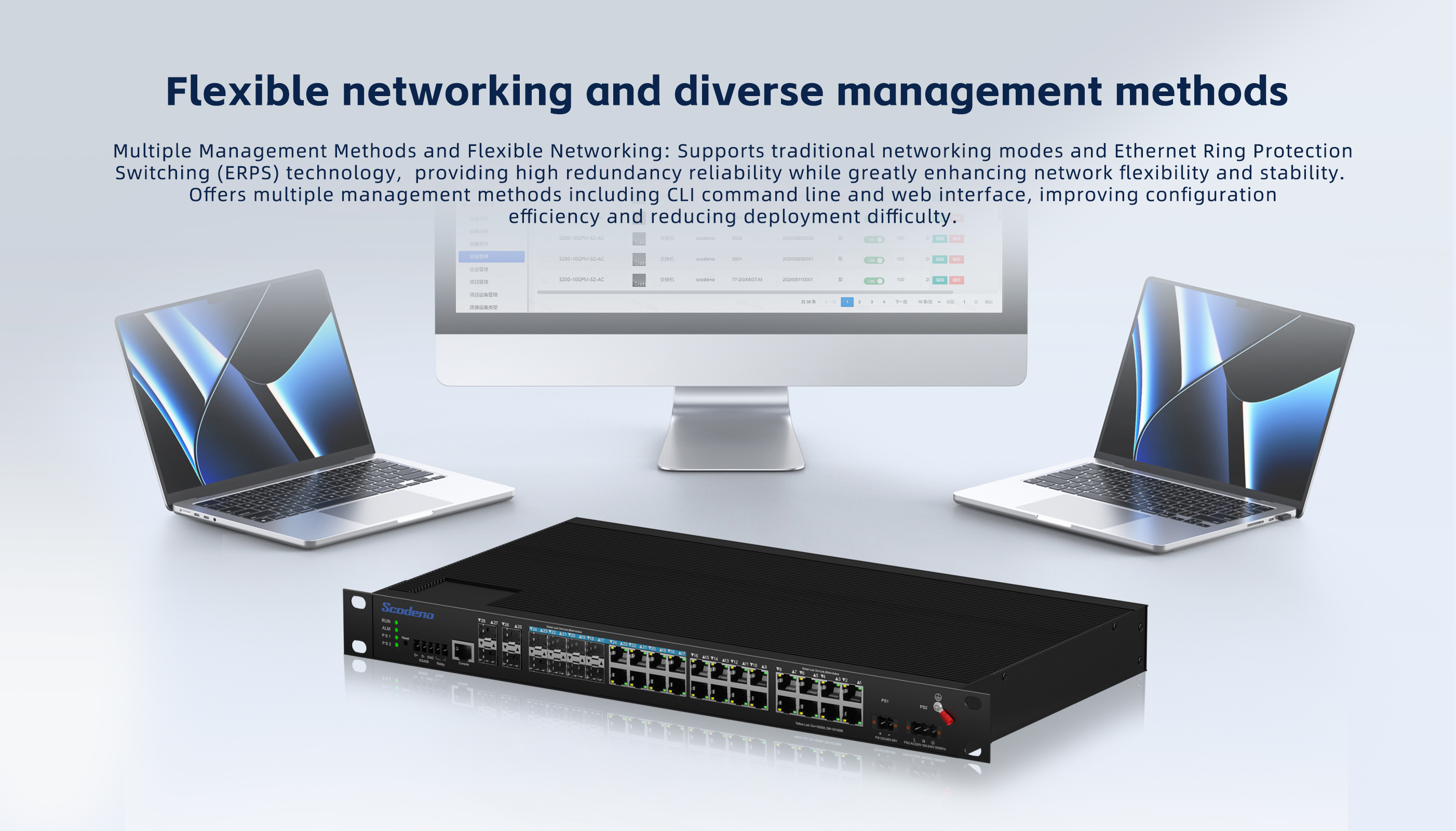 1U rack-mounted design, featuring 4 10G optical ports, 20 Gigabit optical ports, and 8 Gigabit Combo ports in an L3 managed switch. High buffer capacity with zero packet loss, balancing "backbone transmission" and "terminal interconnection" while simplifying network hierarchy.
