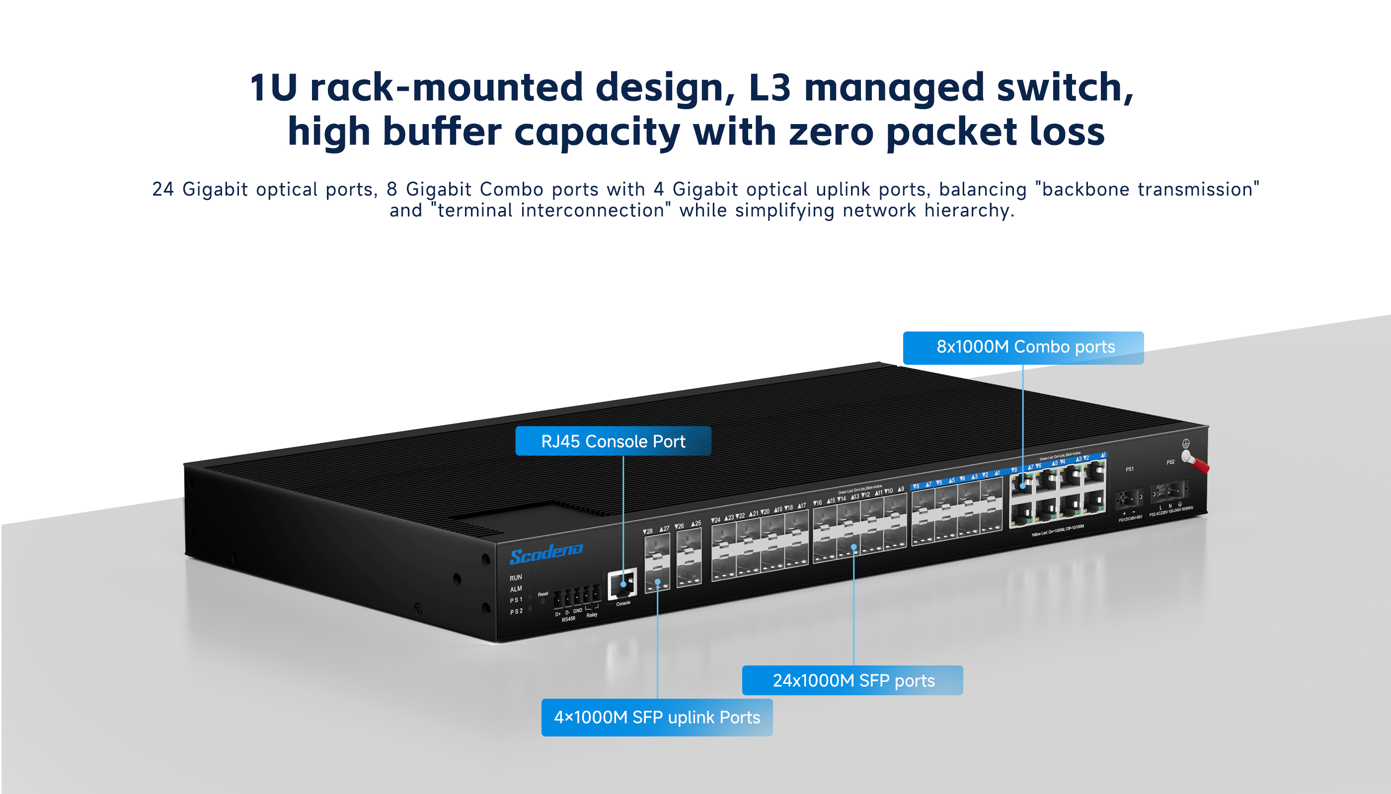 1U rack-mounted design, 20 Gigabit optical ports and 8 Gigabit Combo ports L3 managed switch, high buffer capacity with zero packet loss, balancing "backbone transmission" and "terminal interconnection" while simplifying network hierarchy.