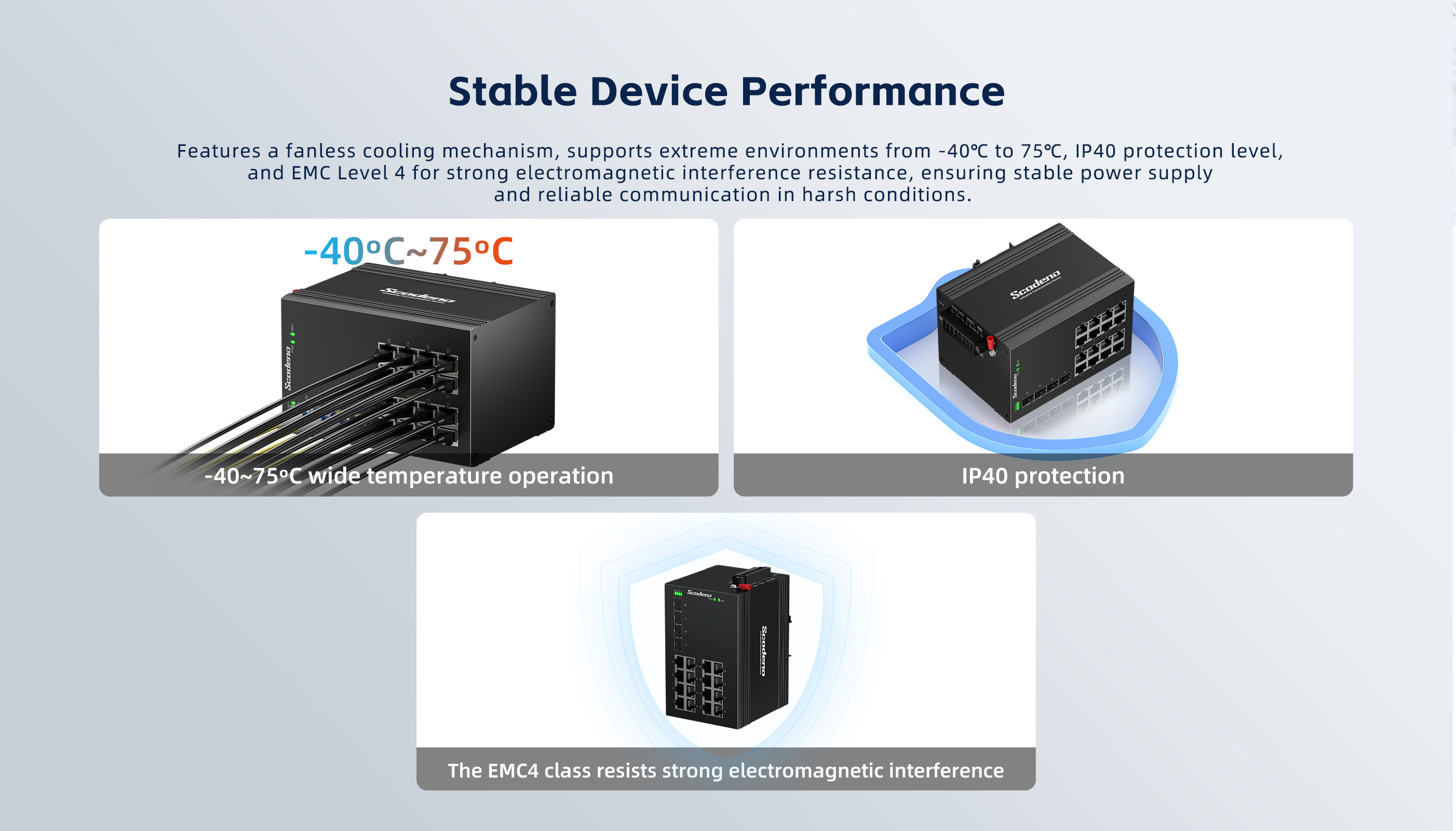 lOperating temperature range of -40°C to +75°C, IP40 protection rating, wide temperature tolerance and high protection capability to withstand harsh environments.