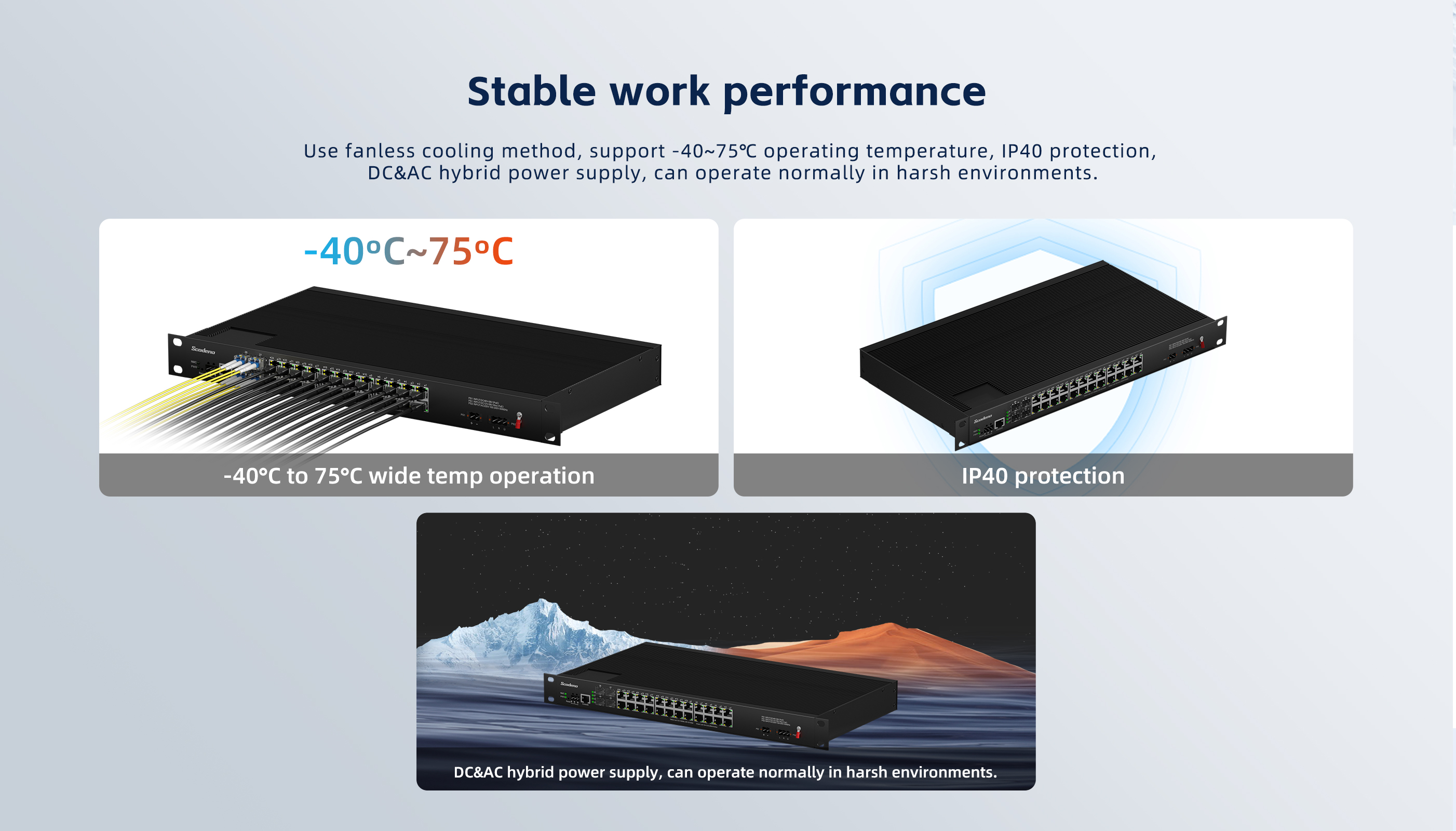 lOperating temperature range of -40℃ to +75℃, IP40 protection rating, wide temperature tolerance and high protection for harsh environments.