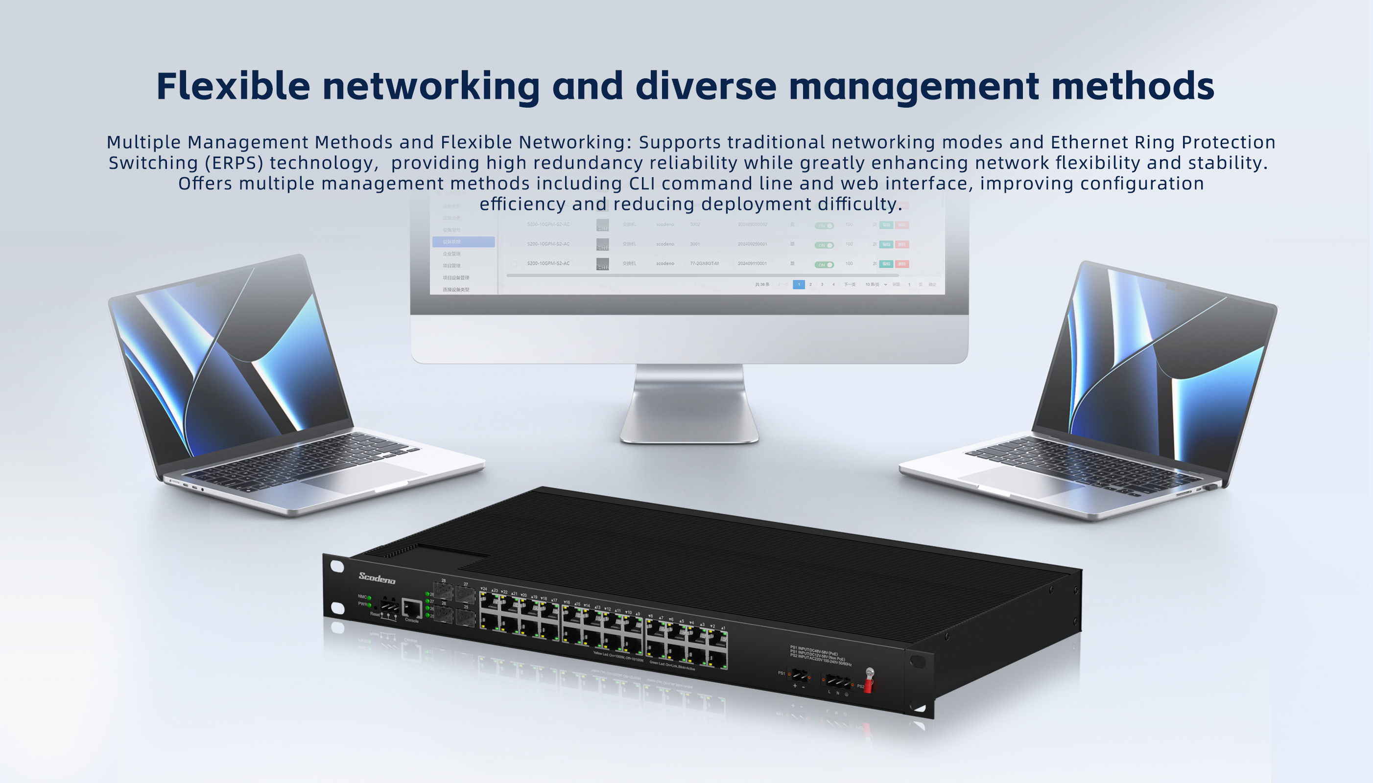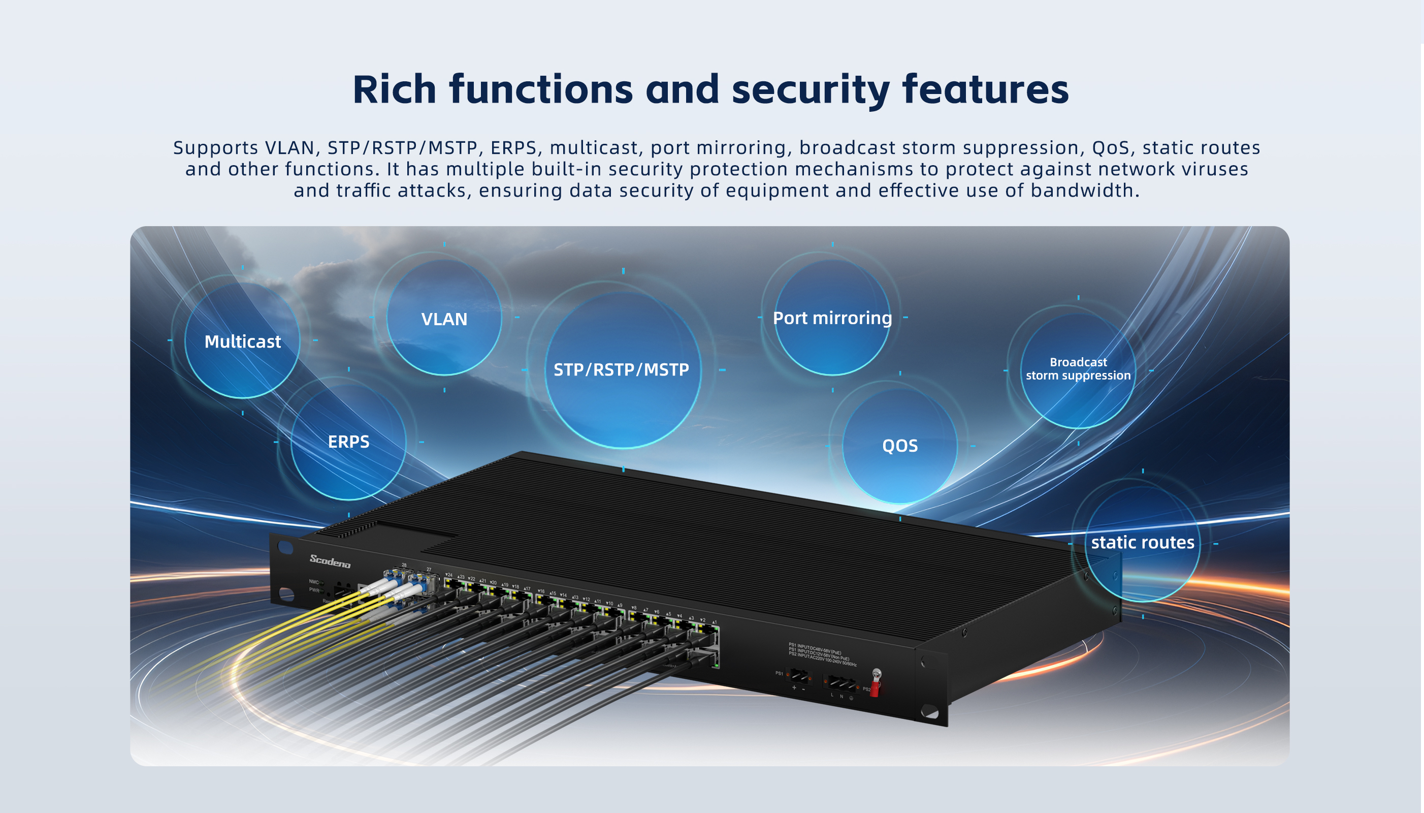1U rack-mountable design, 4 Gigabit optical ports, 24 Gigabit electrical ports L2+ managed switch, high buffer with zero packet loss, balancing "backbone transmission" and "terminal interconnection" to simplify network hierarchy.