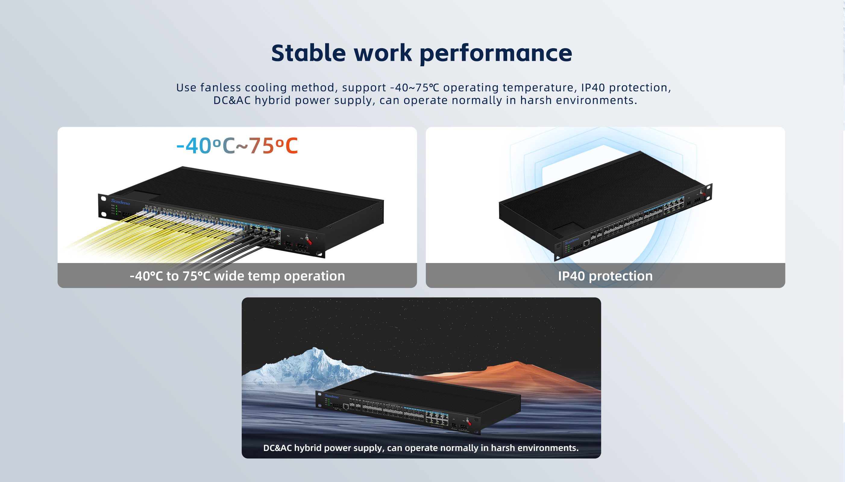 lOperating temperature range of -40℃ to +75℃, IP40 protection rating, wide temperature tolerance and high protection for harsh environments.