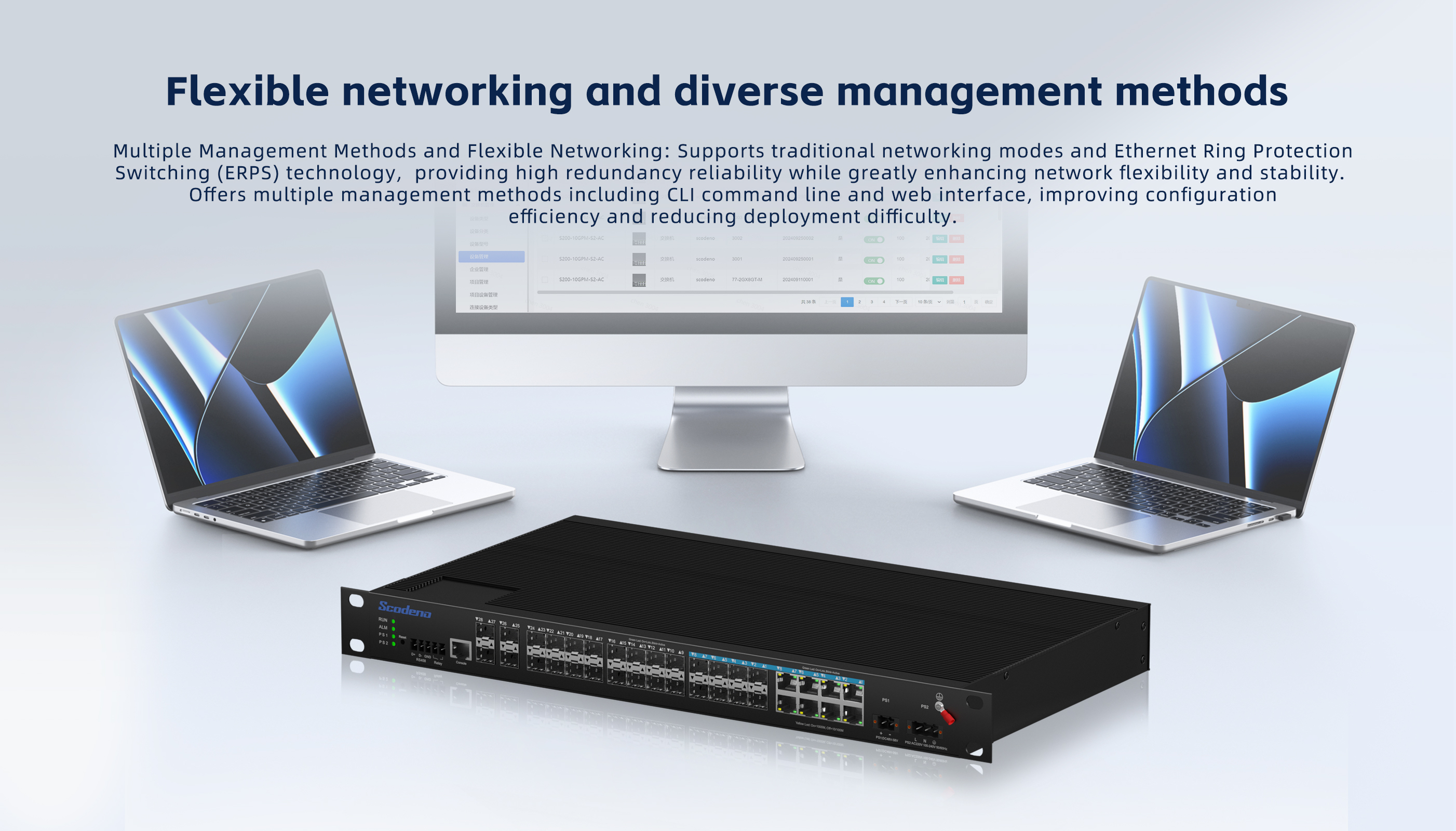 1U rack-mounted design, L2+ managed switch with 4 10G optical ports, 16 Gigabit optical ports, and 8 Combo ports. High buffer capacity with zero packet loss, balancing "backbone transmission" and "terminal interconnection" to simplify network hierarchy.