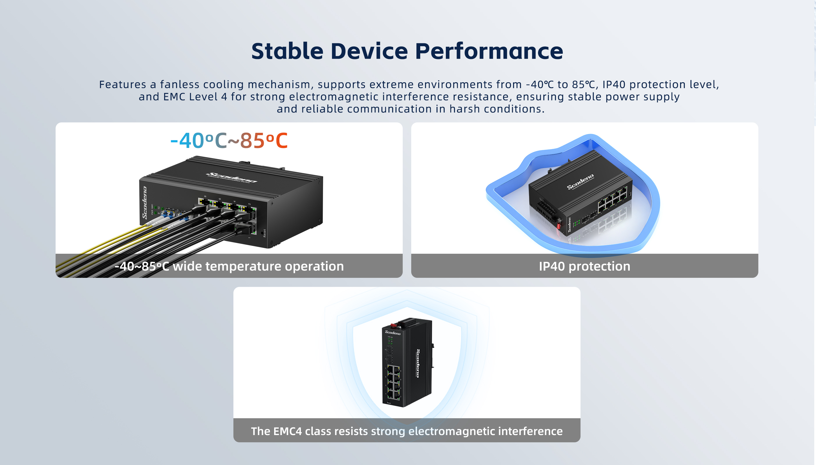 lOperating temperature range of -40°C to +85°C, IP40 protection rating, wide temperature tolerance and high protection capability to withstand harsh environments.