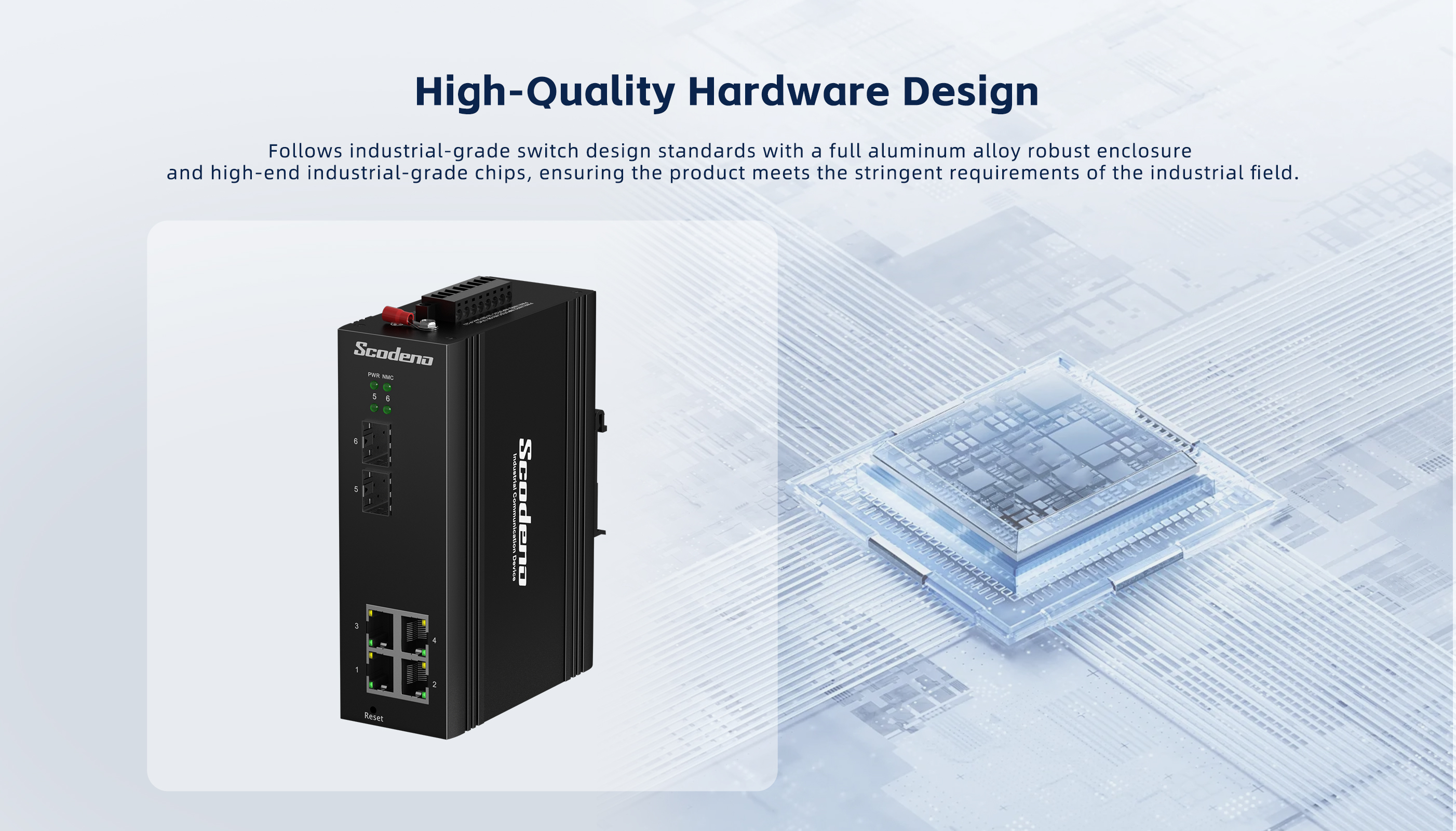 A Layer 2+ managed switch with 2 Gigabit optical port and 4 Gigabit electrical ports, featuring high cache and zero packet loss, balancing "backbone transmission" and "terminal interconnection" to simplify network hierarchy.
