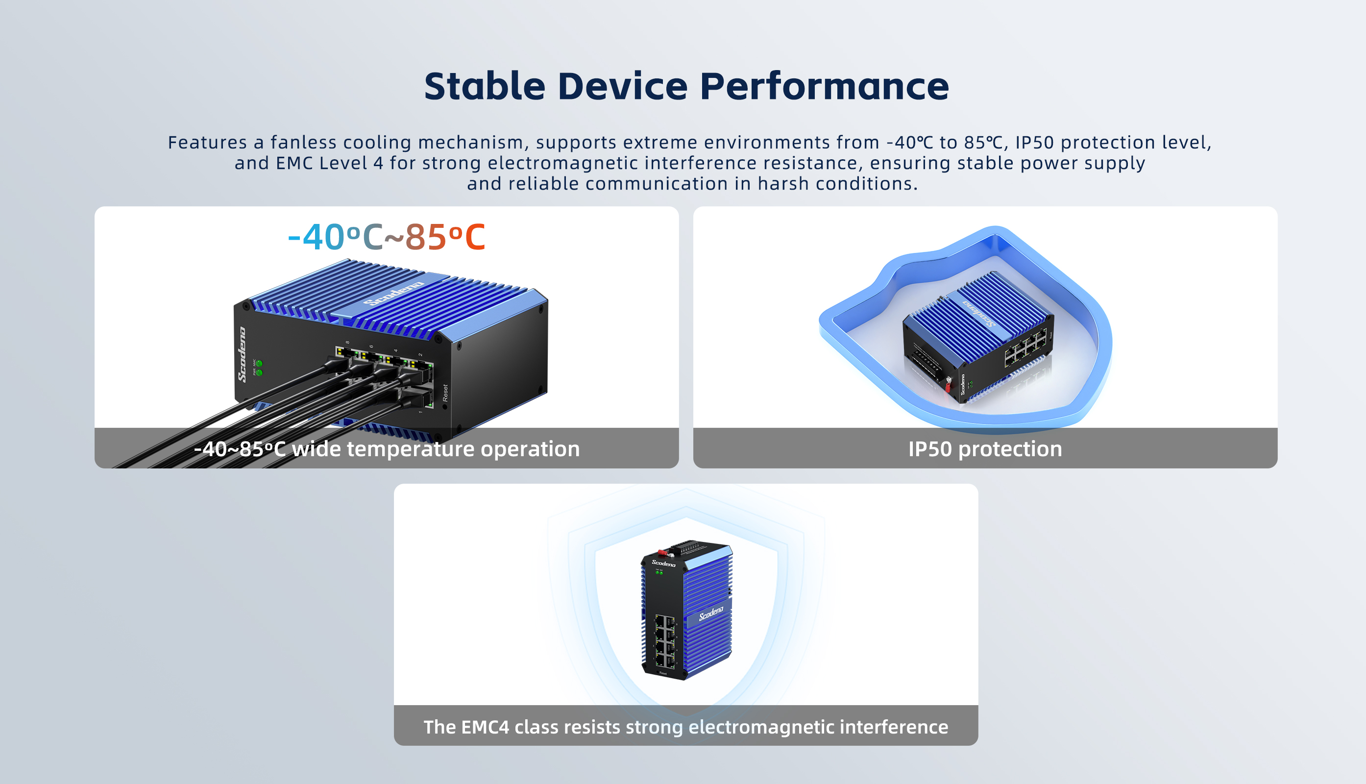 lOperating temperature range of -40℃ to +85℃, IP50 protection rating, wide temperature tolerance and high protection for harsh environments.