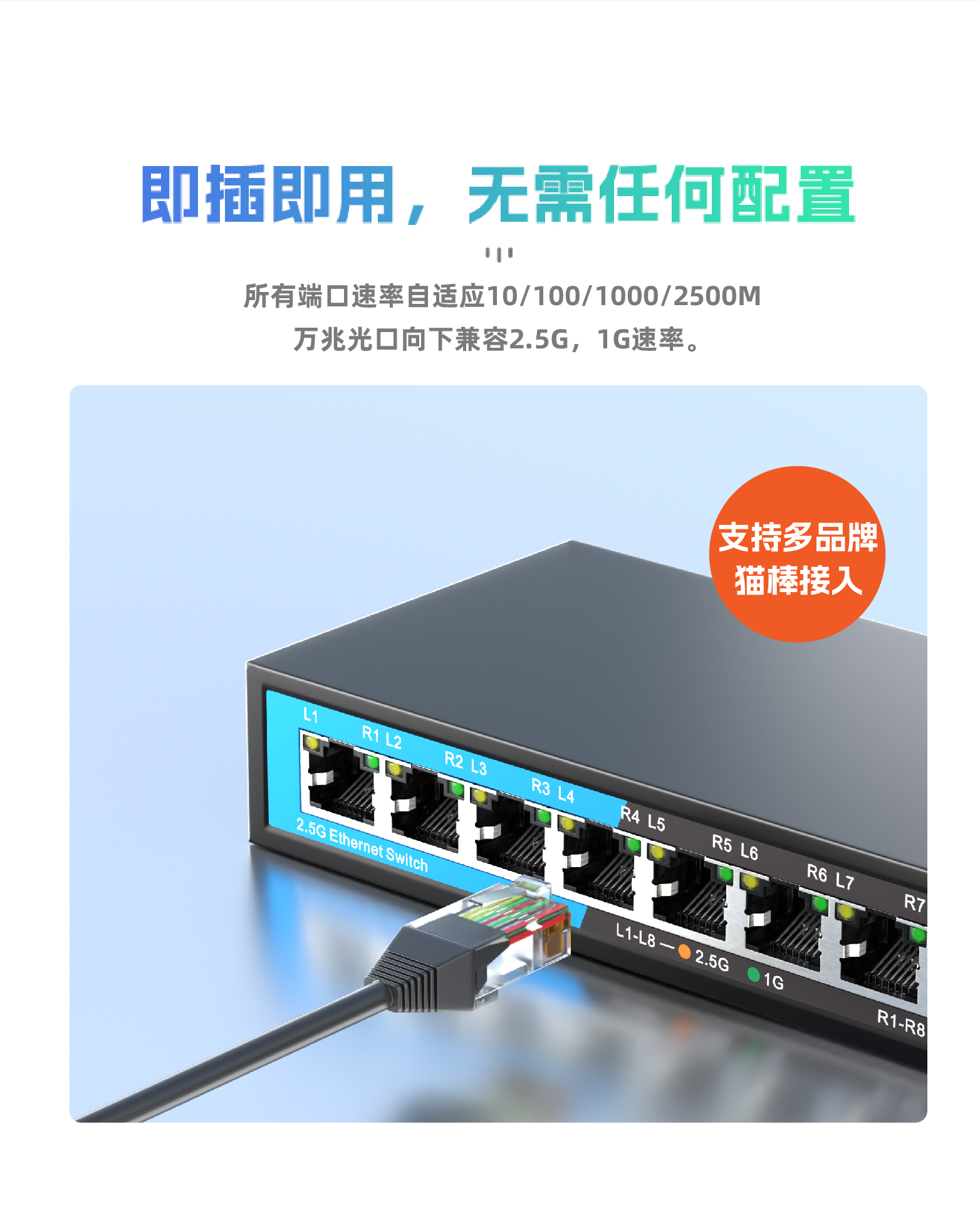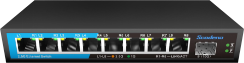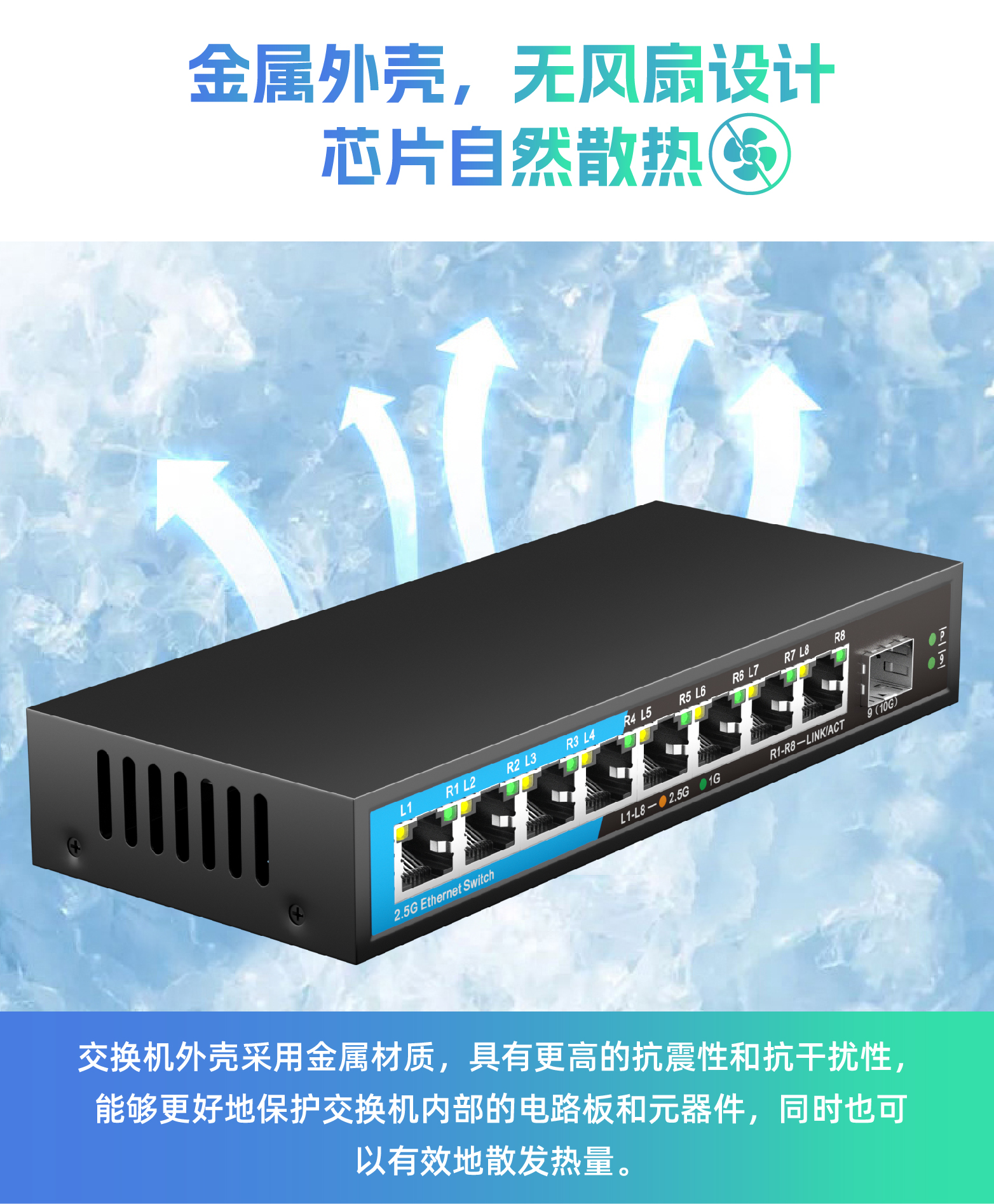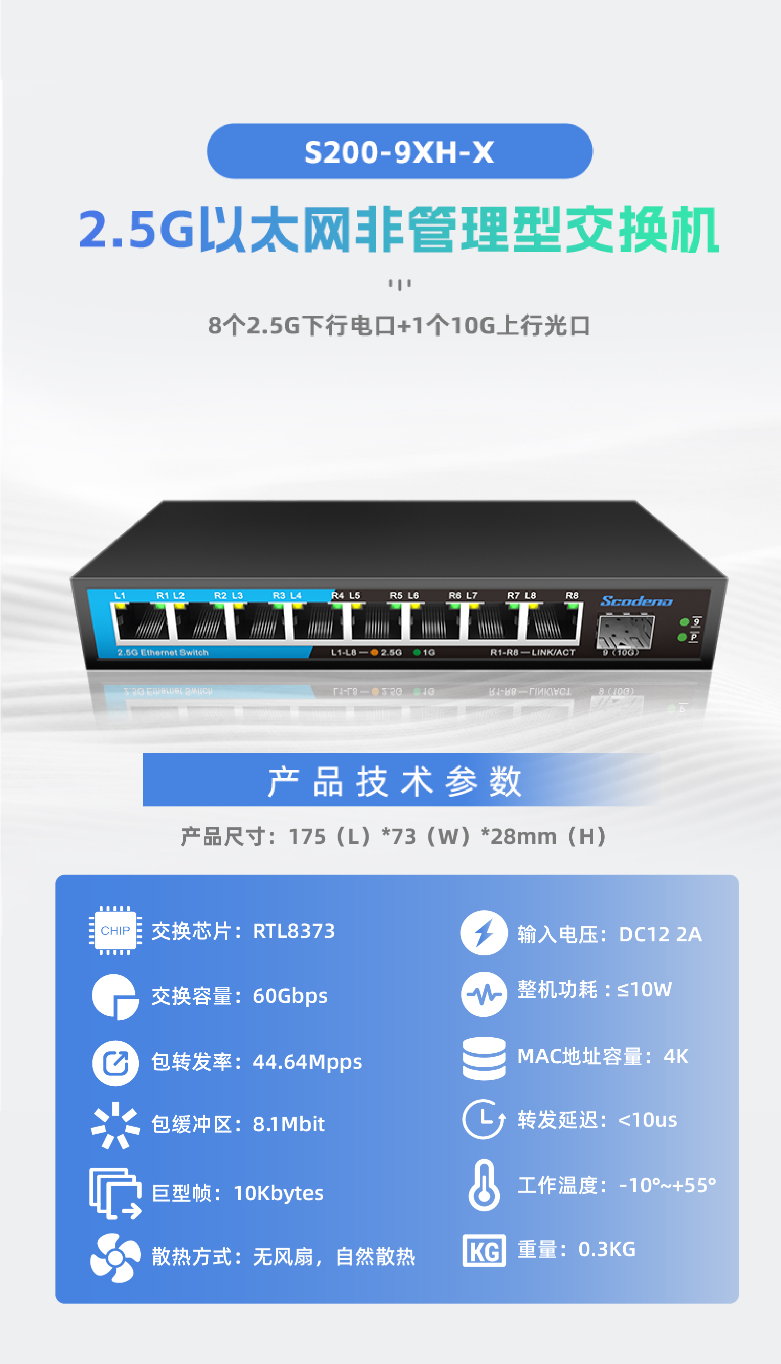 The S200-9XH-X series unmanaged switch has 8 10/100/1000/2500Mbps adaptive RJ45