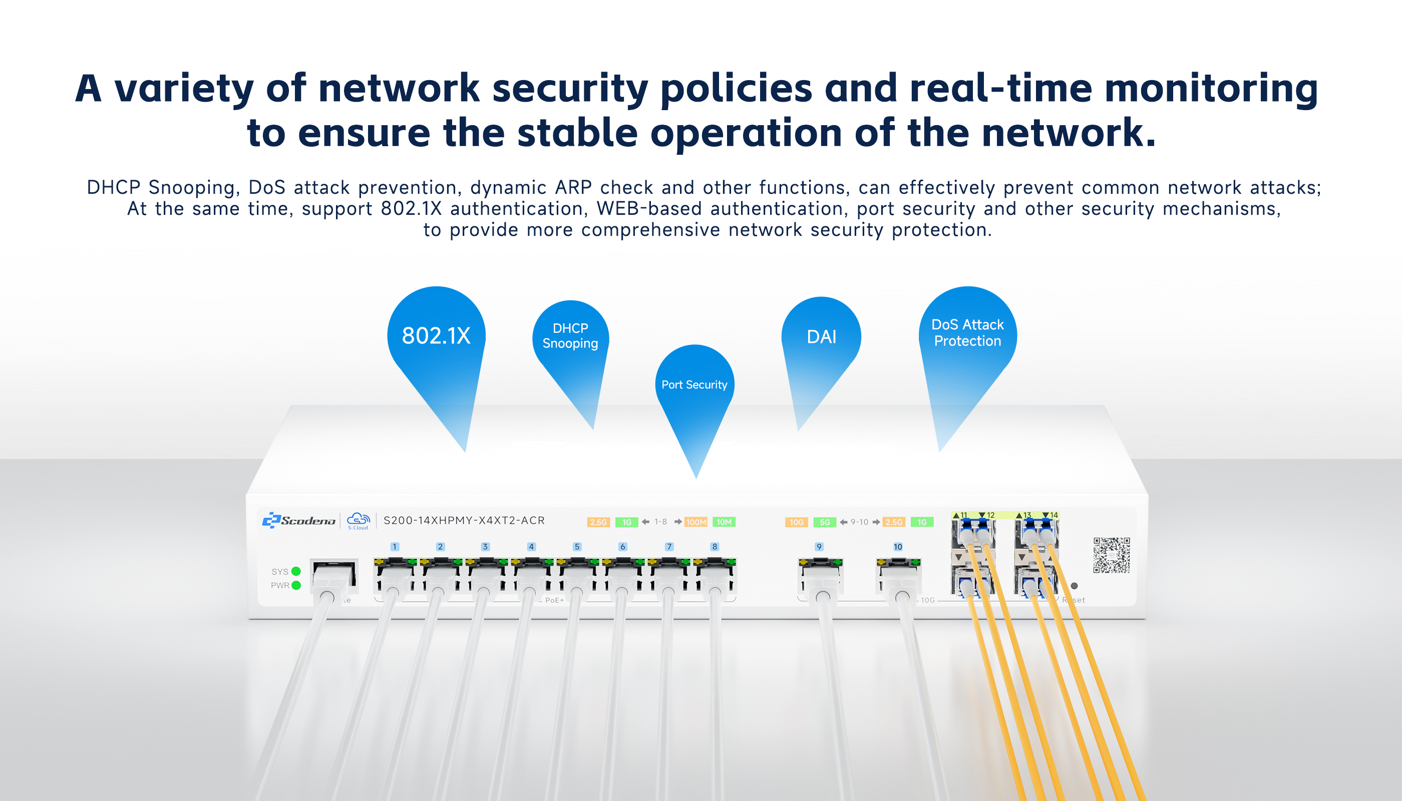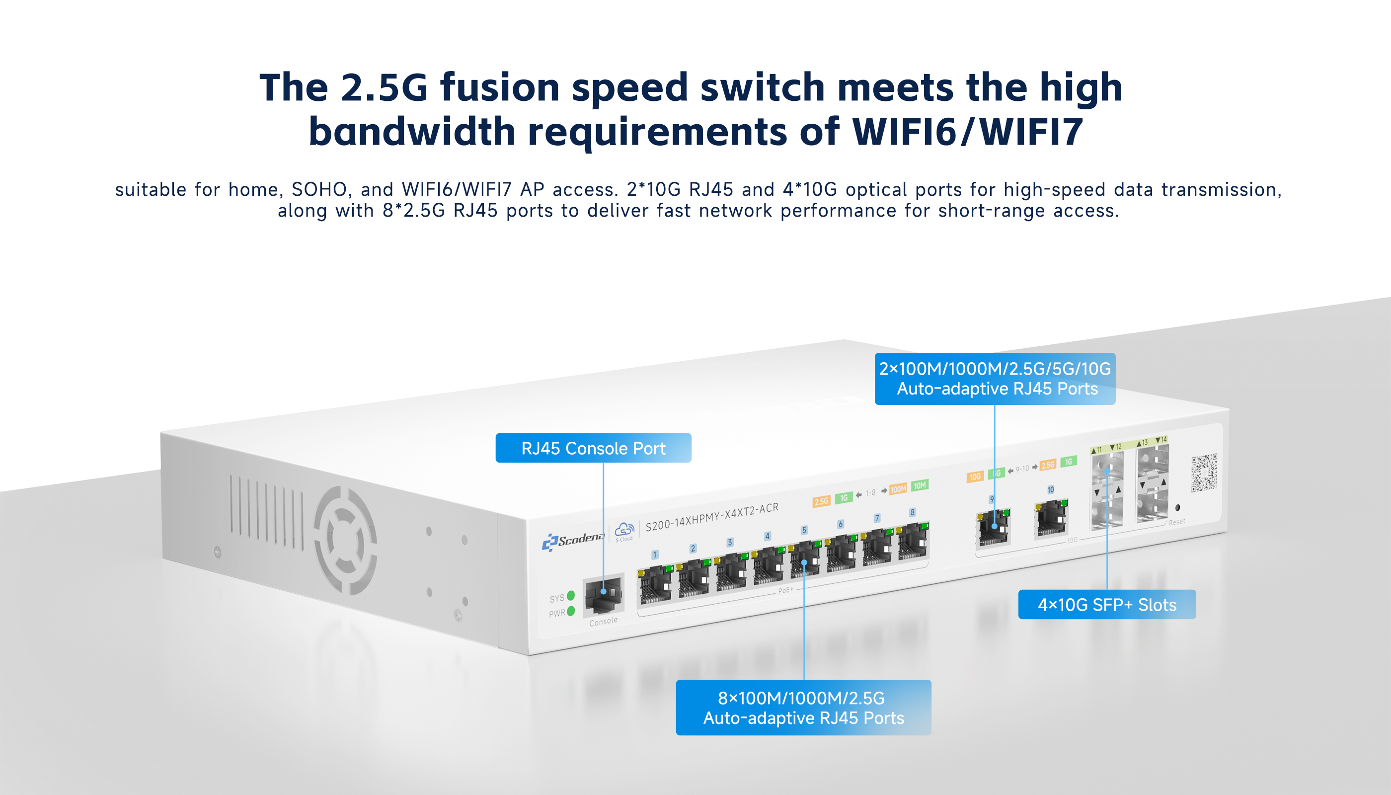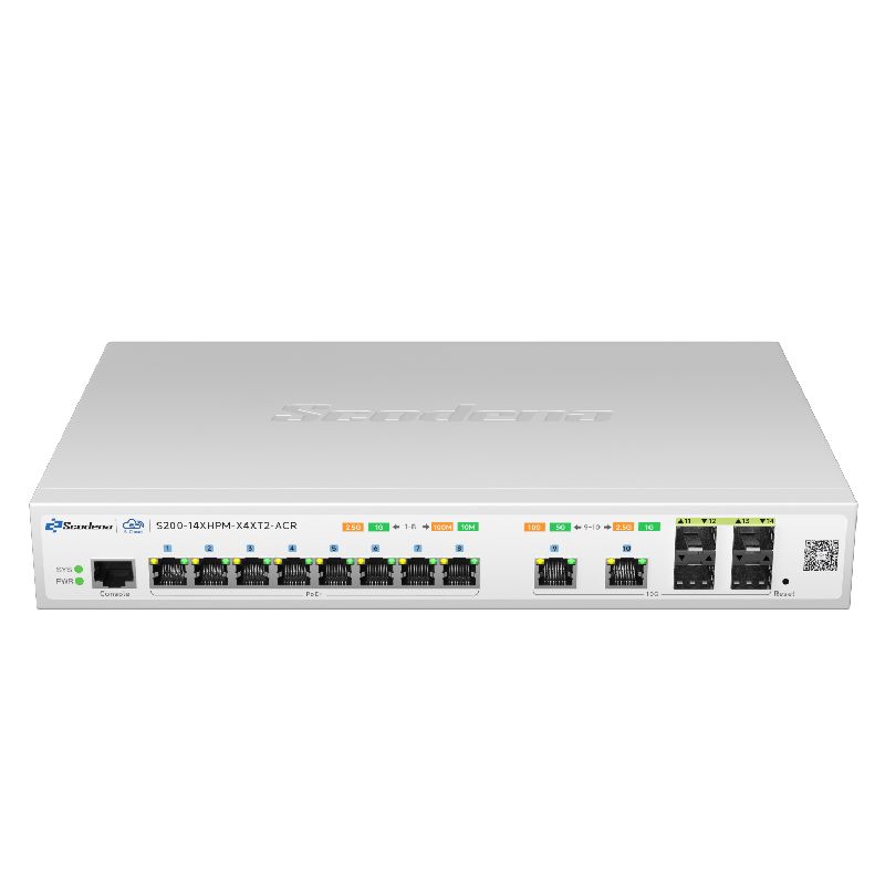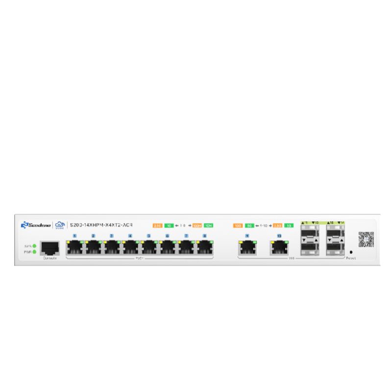 S200-14XHPMY-X4XT2-ACR features 8*10/100/1000M/2.5G adaptive RJ45 ports, 2*10G RJ45 and 4*10G optical uplink ports, designed for WLAN6/WiFi7 applications. Each RJ45 port supports auto-flipping and line-rate forwarding capabilities. Compliant with IEEE 802.3af/at standards, it delivers maximum power supply of 30W per port. Utilizing store-and-forward technology with QoS integration, it ensures efficient bandwidth allocation across all ports for stable data transmission. Multiple management interfaces including CLI, WEB, and cloud-based management simplify operation and maintenance.