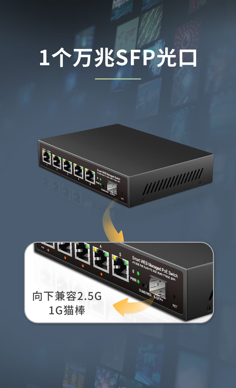 2 10G SFP optical interfaces. Each RJ45 port supports automatic flipping and line speed forwarding