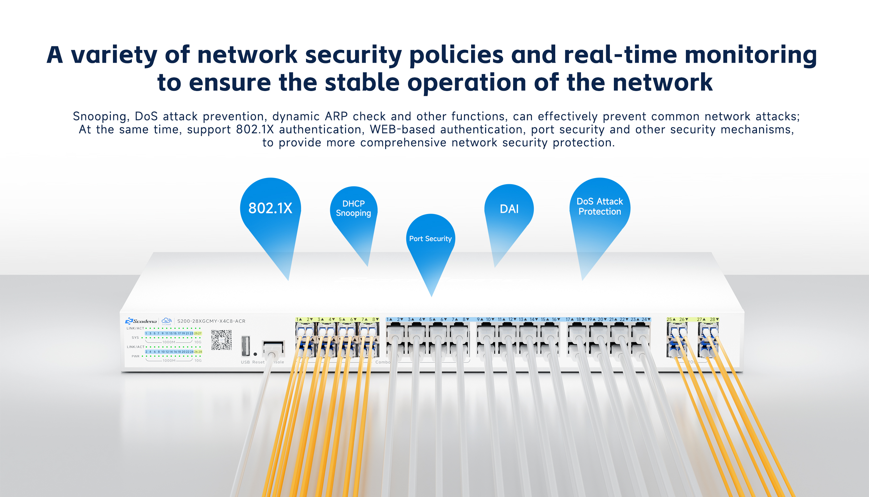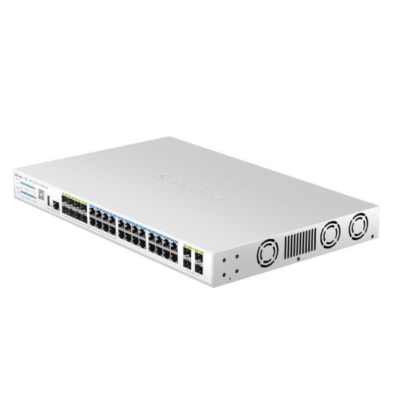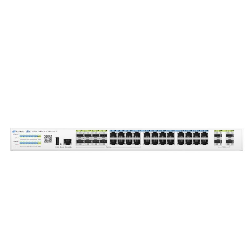 S200-28XGCMY-X4C8-ACR features 24 adaptive RJ45 ports (10/100/1000Mbps), 8*1000M Combo ports and 4*10G SFP+ optical interfaces. Each RJ45 port supports auto-port switching and line-rate forwarding capabilities. Utilizing store-and-forward technology with QoS integration, it ensures efficient bandwidth allocation across all ports for stable data transmission. The system provides multiple management options including CLI, web interface, and cloud-based administration, delivering intuitive operation and simplified maintenance.