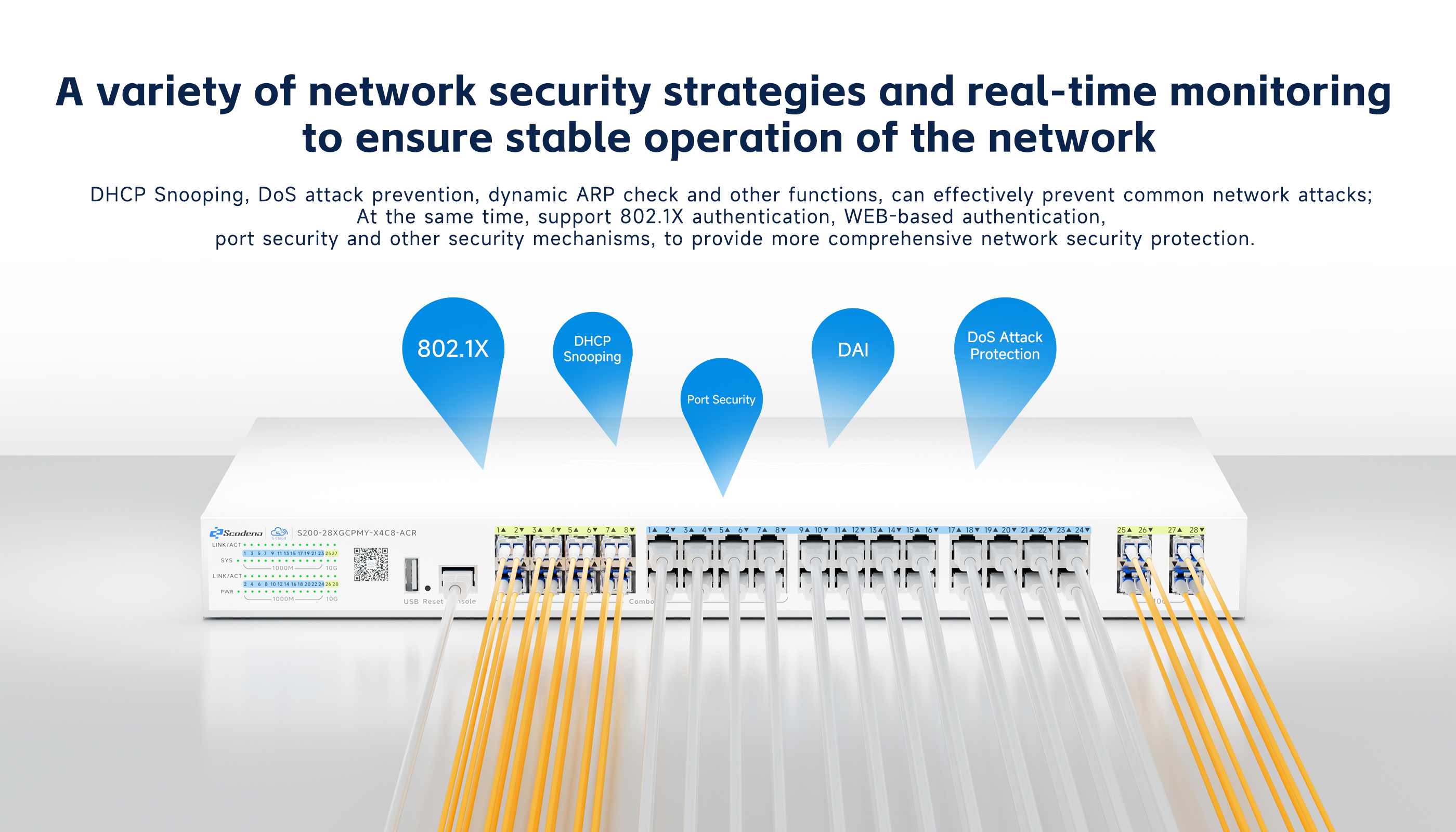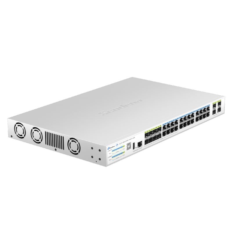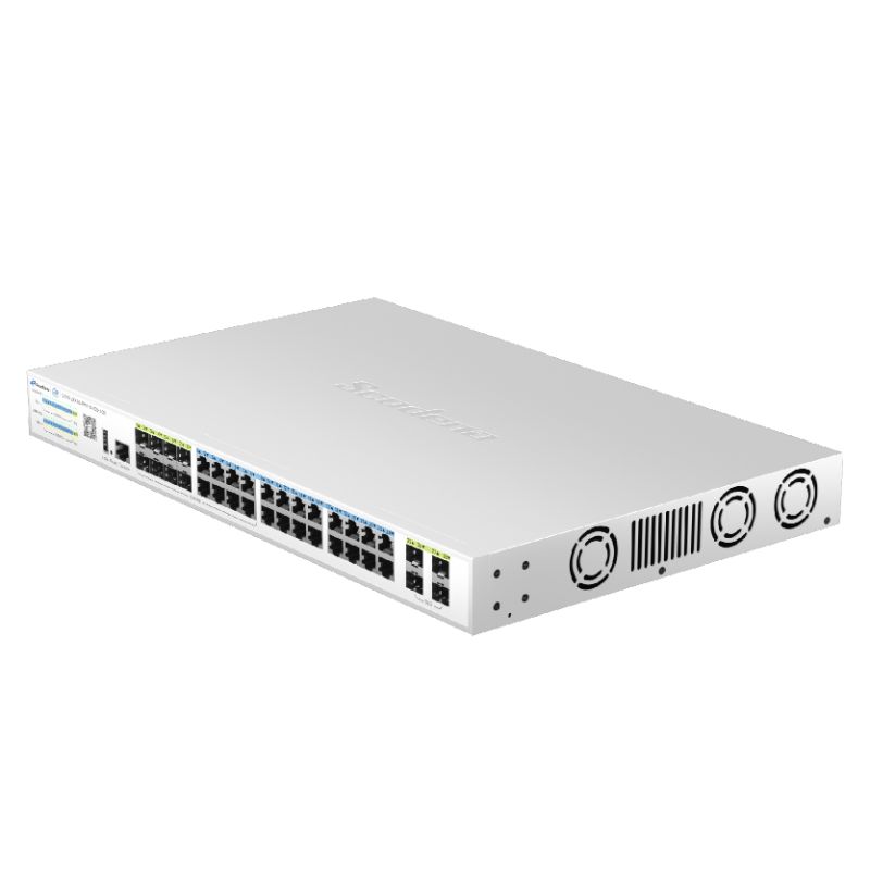 S200-28XGCPMY-X4C8-ACR features 24 adaptive RJ45 ports (10/100/1000Mbps) ,8*SFP Combo ports and 4*10G SFP+ optical interfaces. Each RJ45 port supports auto-port switching and line-rate forwarding capabilities,complying with IEEE 802.3af/at standards. Maximum single-port power is 30W. Utilizing store-and-forward technology with QoS integration, it ensures efficient bandwidth allocation across all ports for stable data transmission. The system provides multiple management options including CLI, web interface, and cloud-based administration, delivering intuitive operation and simplified maintenance.