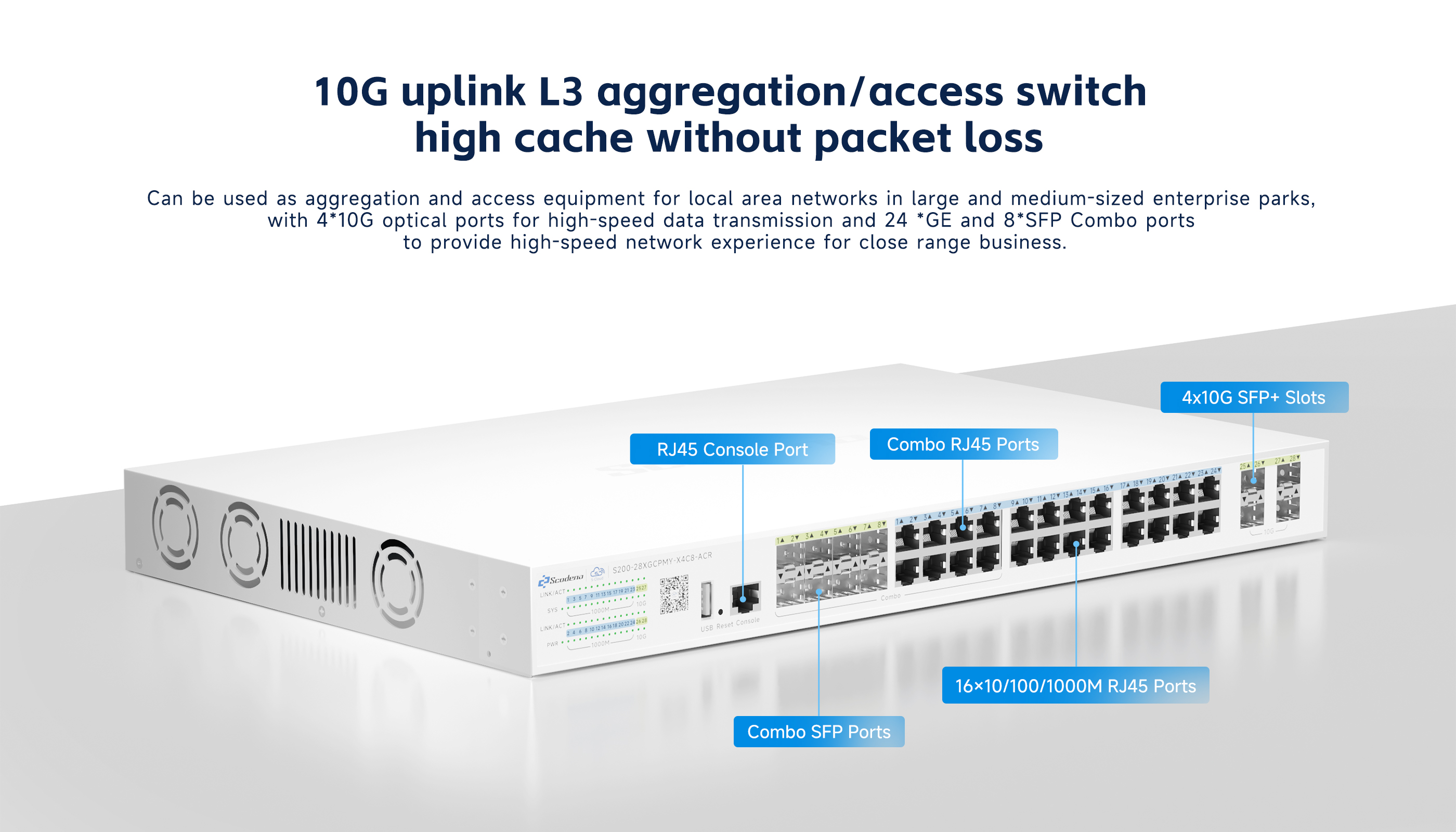·24*1000M RJ45 ports, 8*SFP Combo ports,4*10G SFP+ ports for upstream connections.