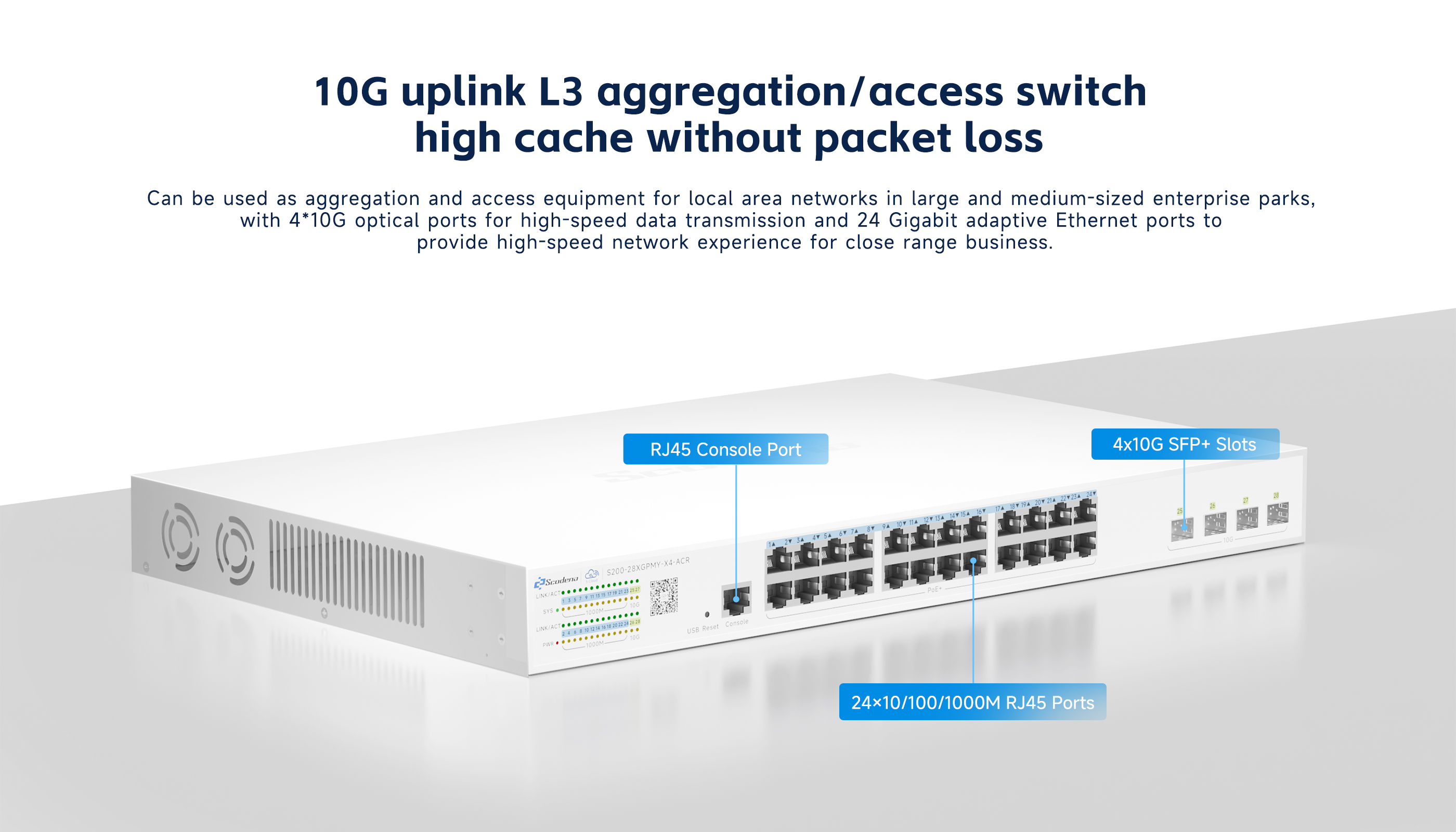 ·24*1000M RJ45 ports, 4*10G SFP+ ports for upstream connections, 12M cache.
