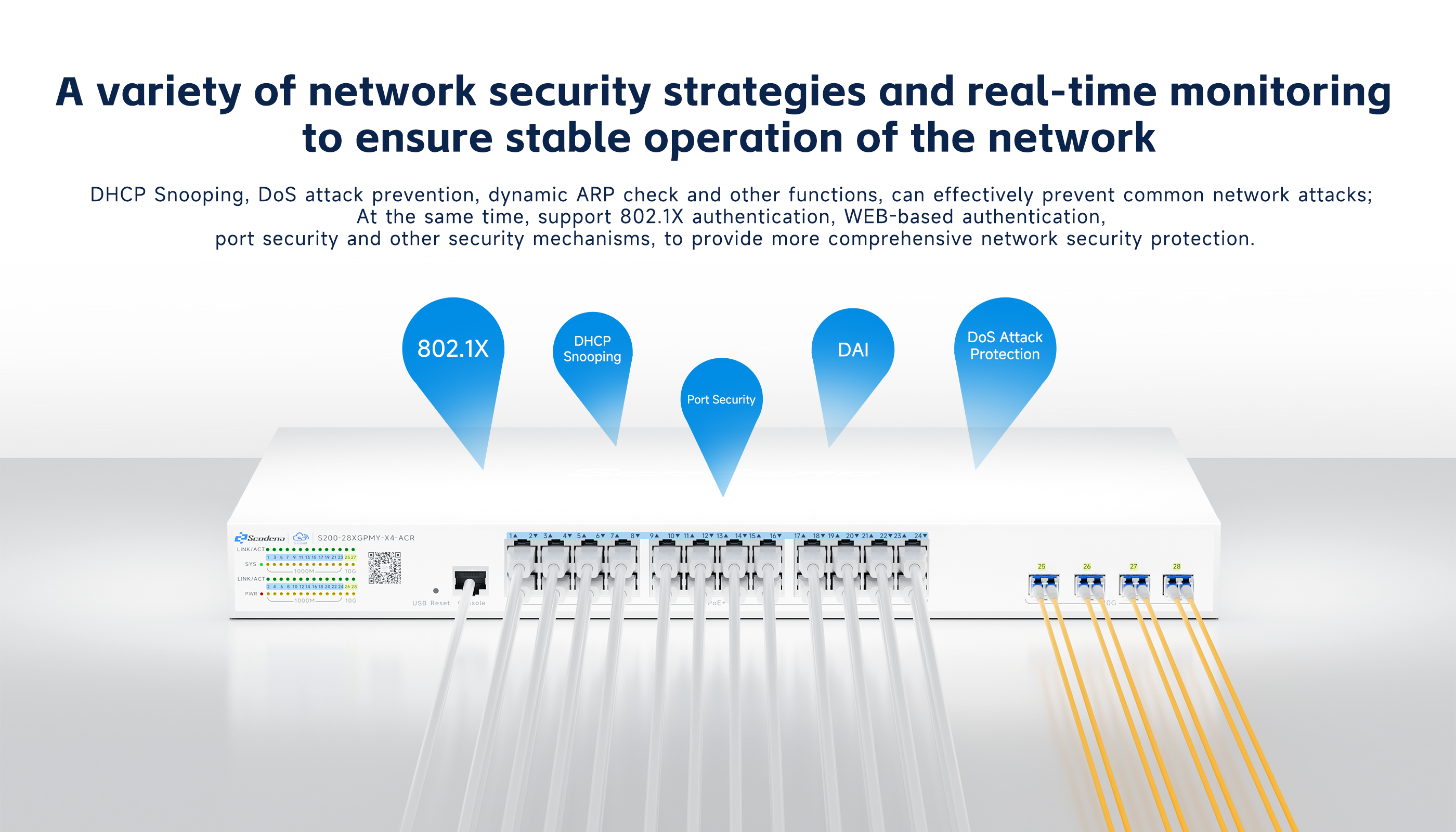 S200-28XGPMY-X4-ACR features 24 adaptive RJ45 ports (10/100/1000Mbps) and 4*10G SFP+ optical interfaces. Each RJ45 port supports auto-port switching and line-rate forwarding capabilities,complying with IEEE 802.3af/at standards. Maximum single-port power is 30W. Utilizing store-and-forward technology with QoS integration, it ensures efficient bandwidth allocation across all ports for stable data transmission. The system provides multiple management options including CLI, web interface, and cloud-based administration, delivering intuitive operation and simplified maintenance.