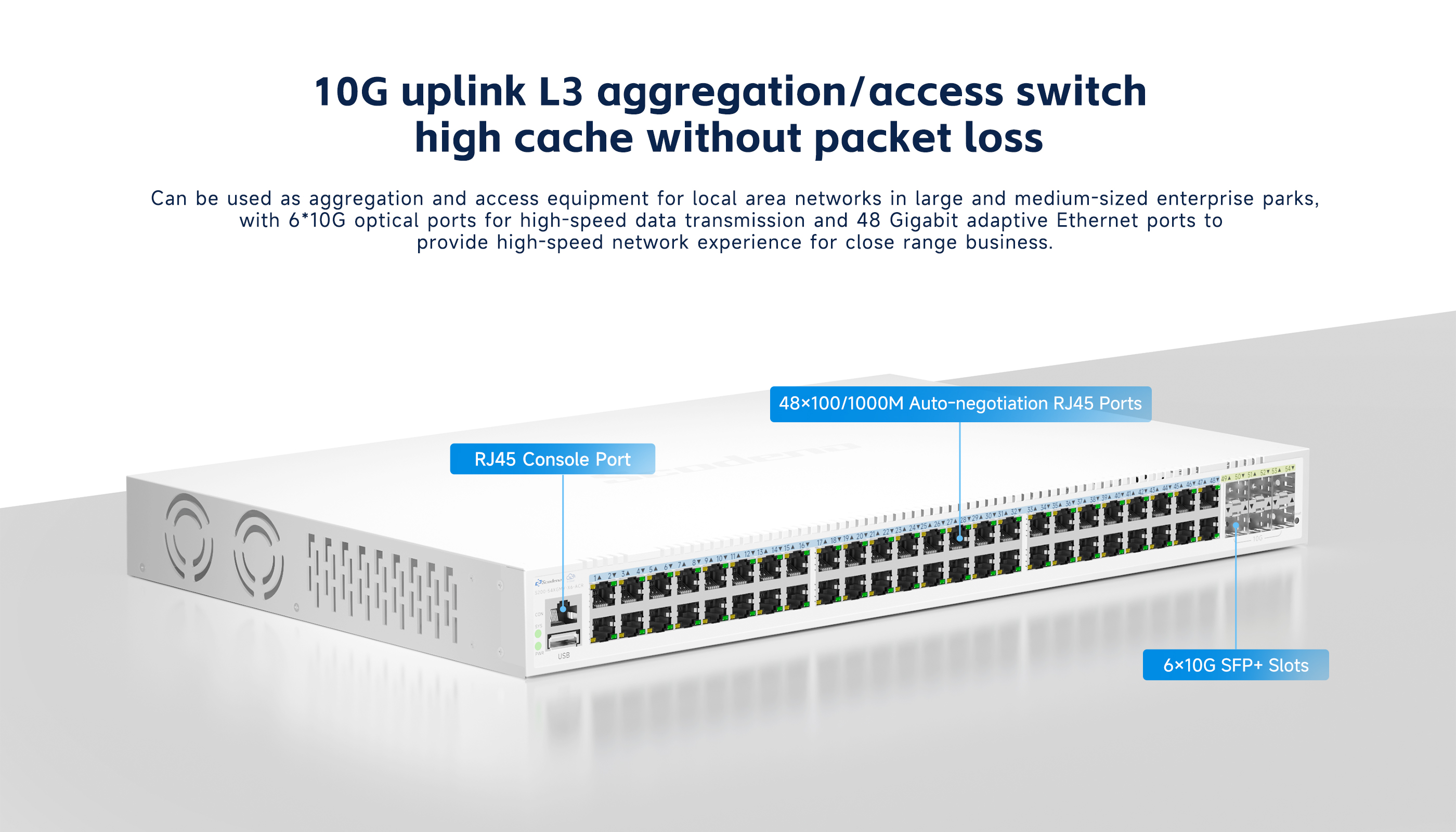 · 48*1000M RJ45 ports, 6*10G SFP+ ports for upstream connections, 16MB cache.