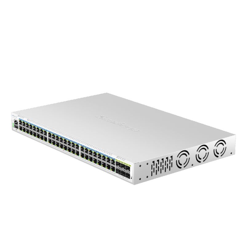 S200-54XGPMY-X6-ACR features 48 adaptive RJ45 ports (10/100/1000Mbps) and 6*10G SFP+ optical interfaces. Each RJ45 port supports auto-port switching and line-rate forwarding capabilities,complying with IEEE 802.3af/at standards. Maximum single-port power is 30W. Utilizing store-and-forward technology with QoS integration, it ensures efficient bandwidth allocation across all ports for stable data transmission. The system provides multiple management options including CLI, web interface, and cloud-based administration, delivering intuitive operation and simplified maintenance.