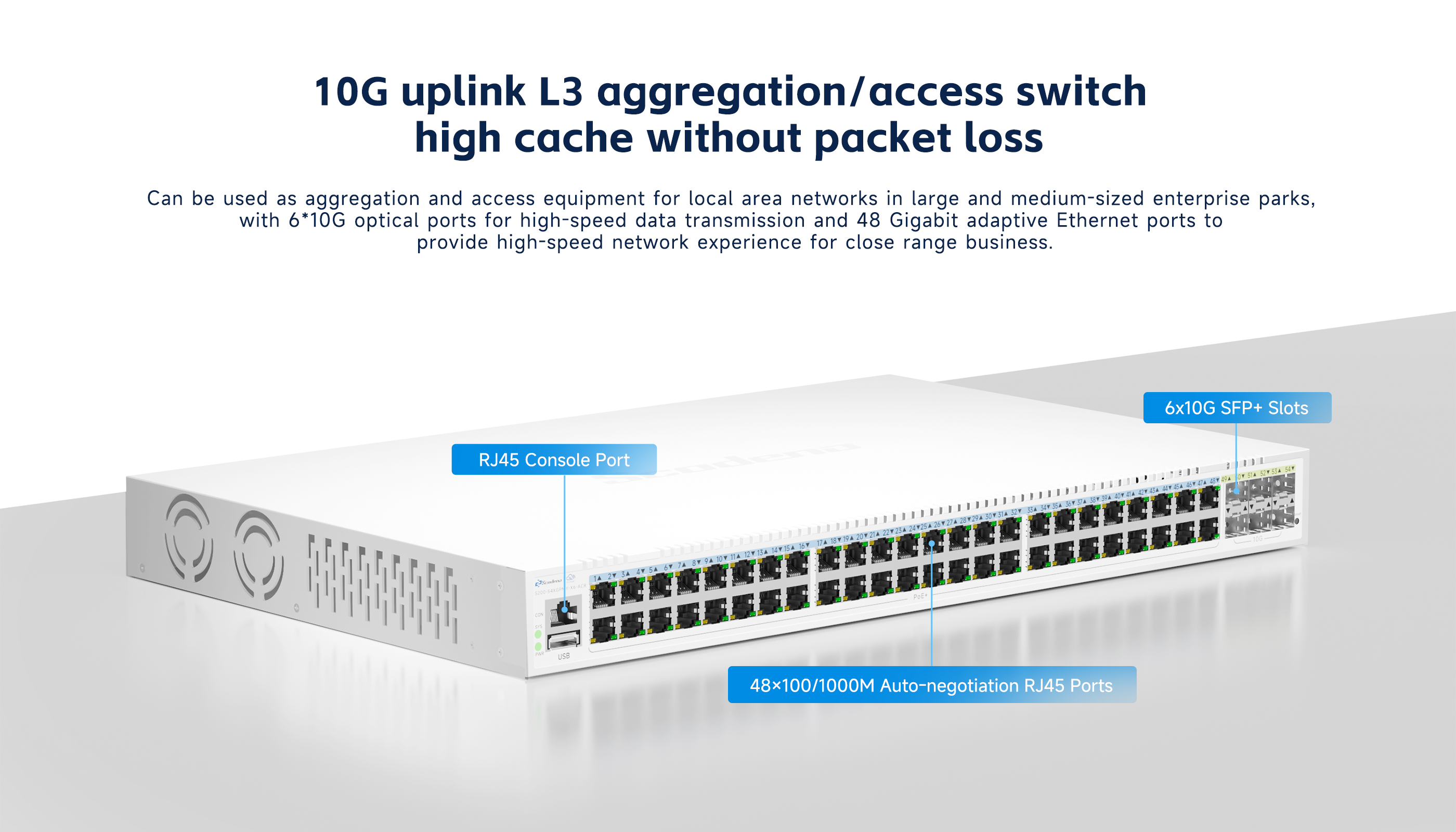 · 48*1000M RJ45 ports, 6*10G SFP+ ports for upstream connections, 16MB cache.