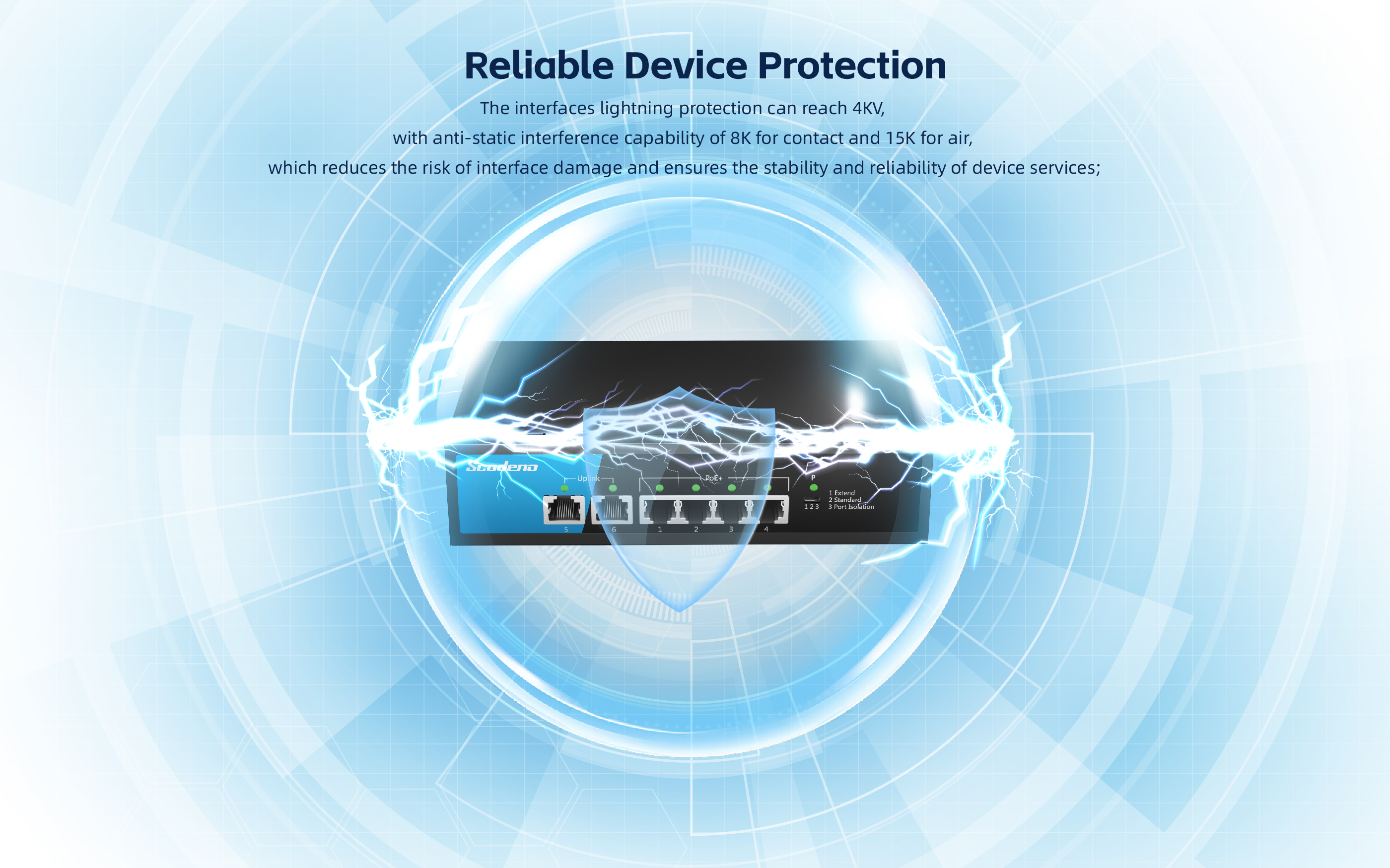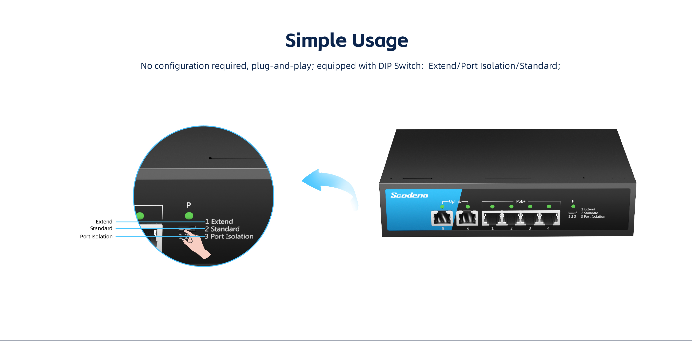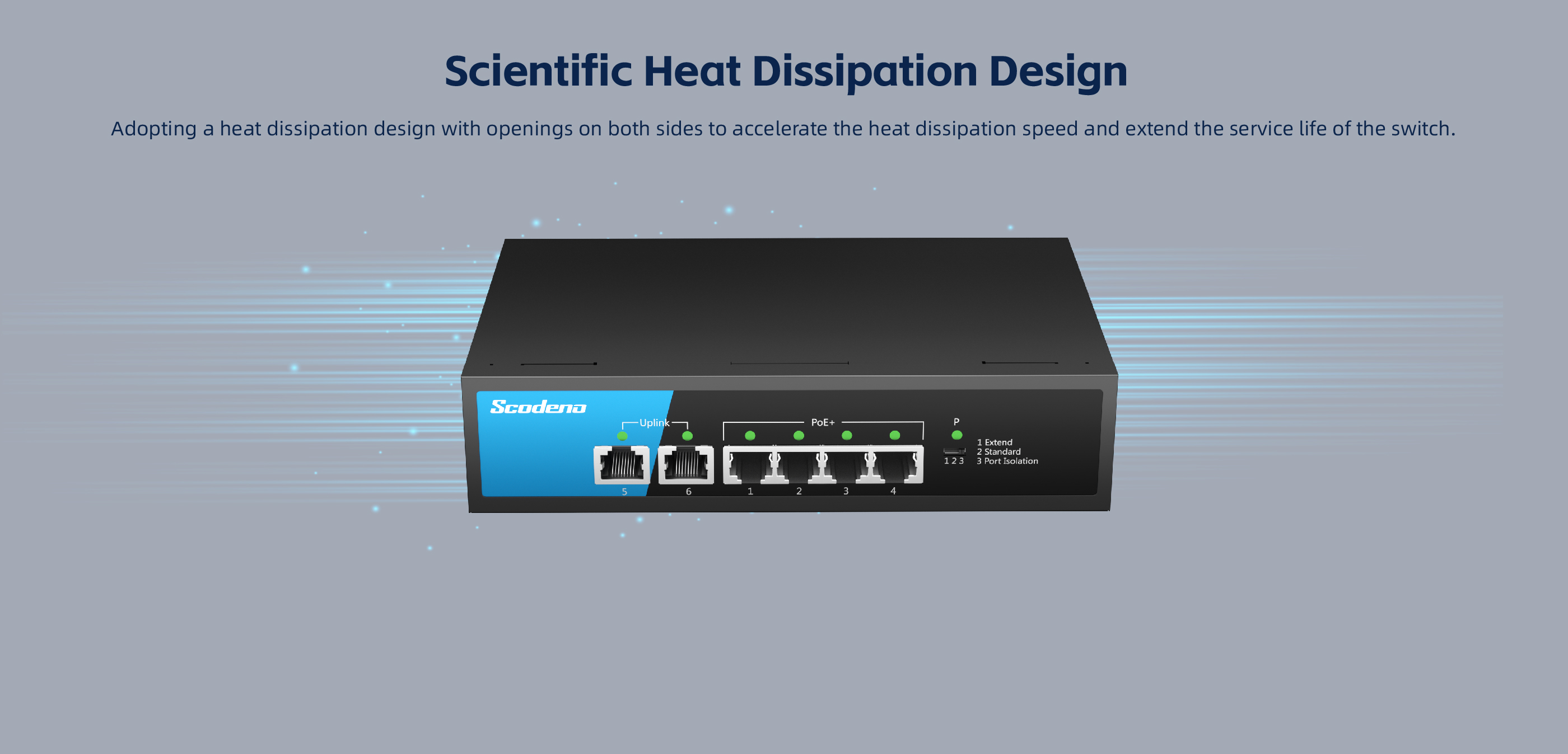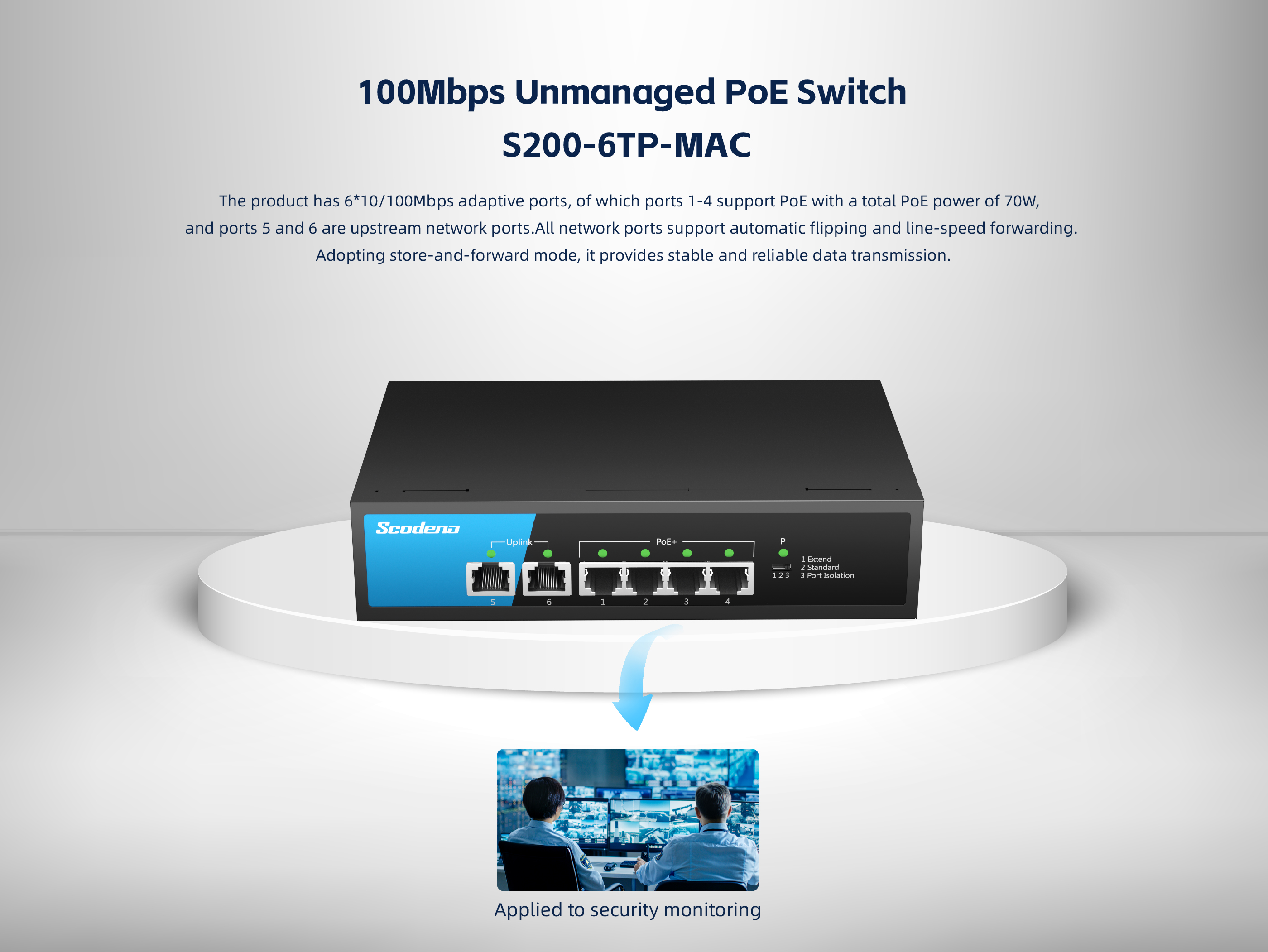 The S200-6TP-MAC series unmanaged PoE switch has 6 10/100Mbps adaptive ports, of