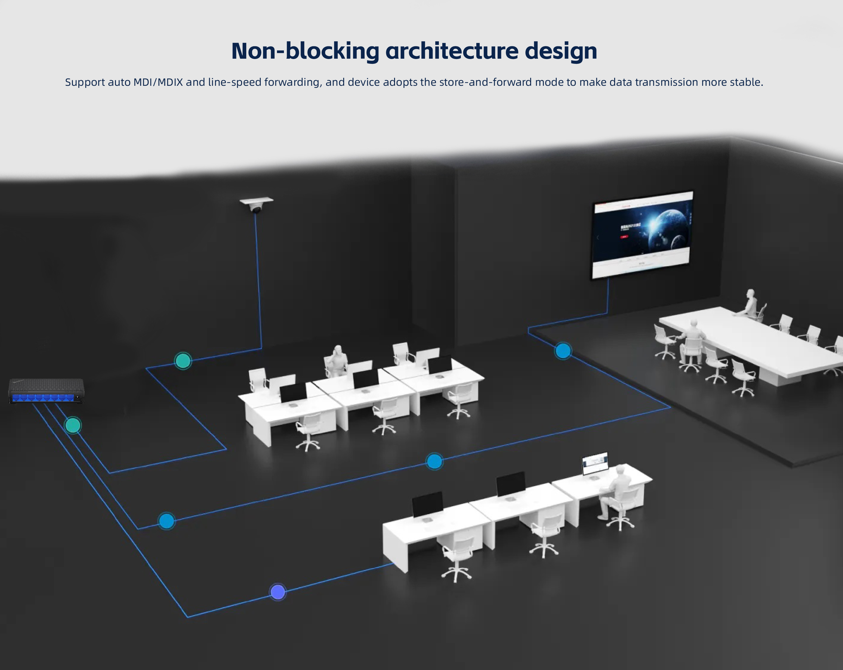 The product adopts storage and forwarding, fanless design, rich indicator light interfaces,