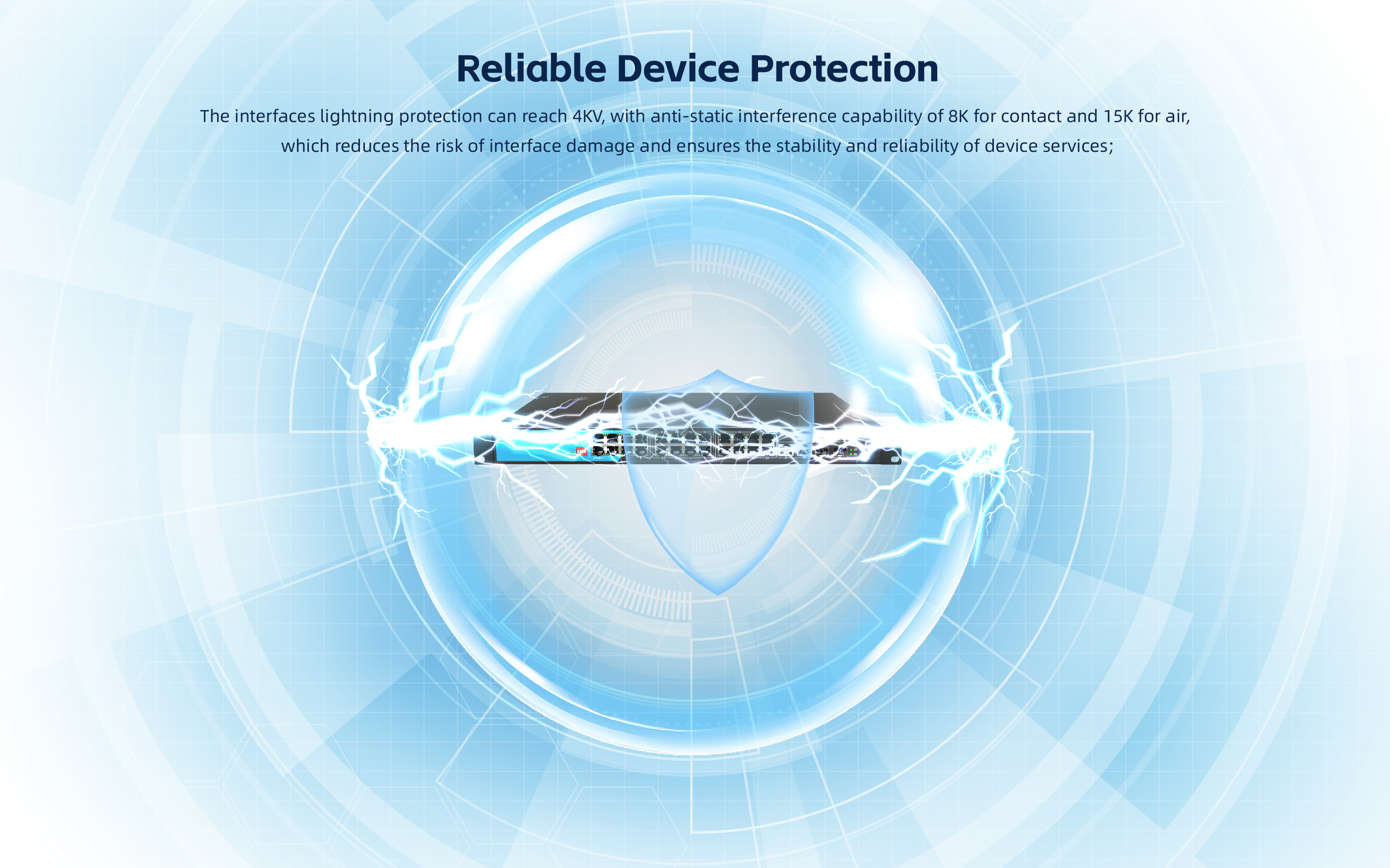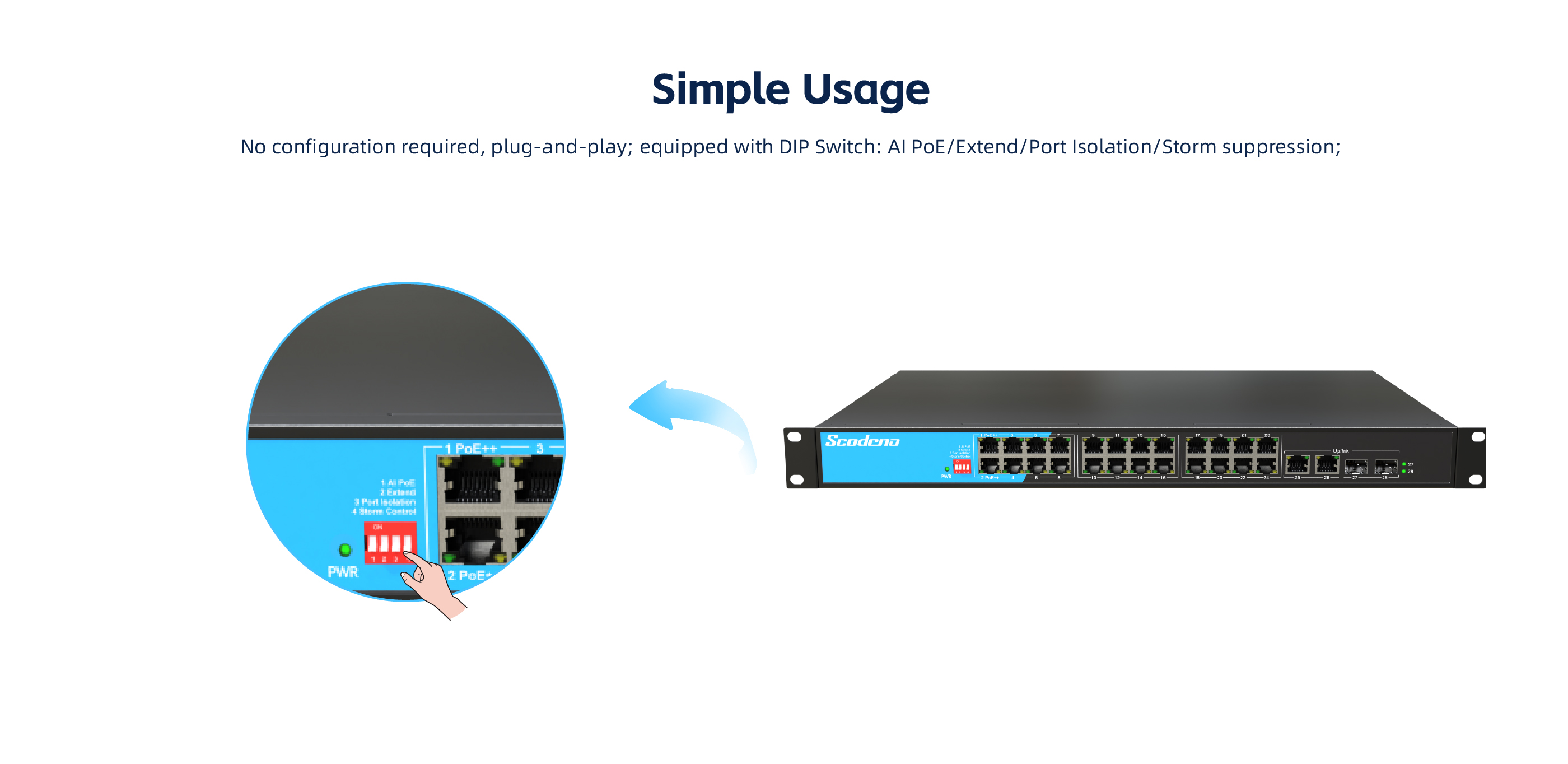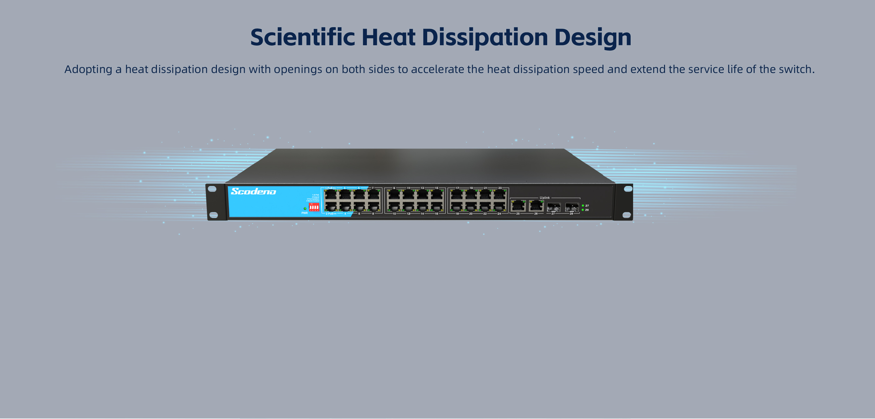 100/1000 upstream SFP optical ports. Each RJ45 port supports automatic flipping and