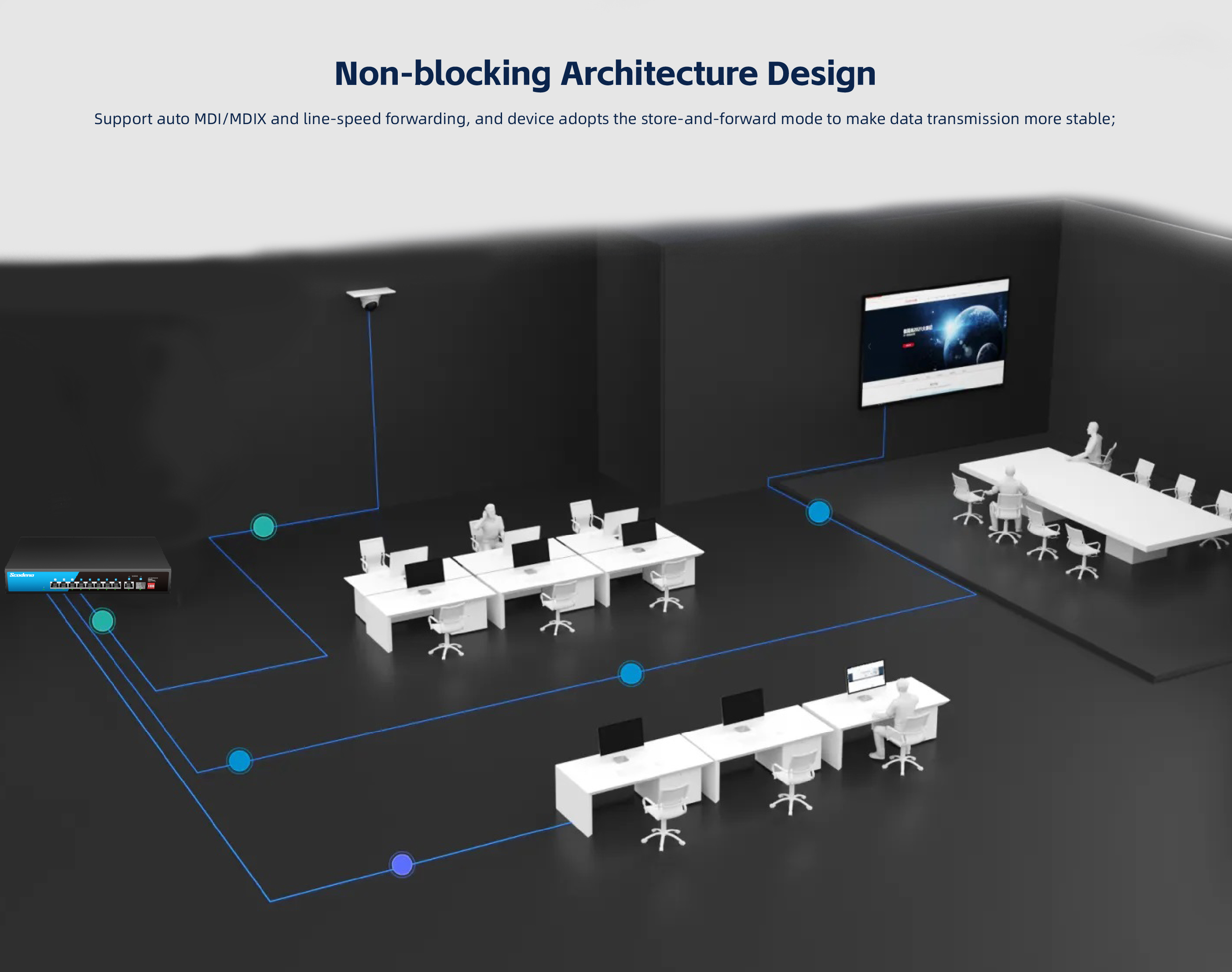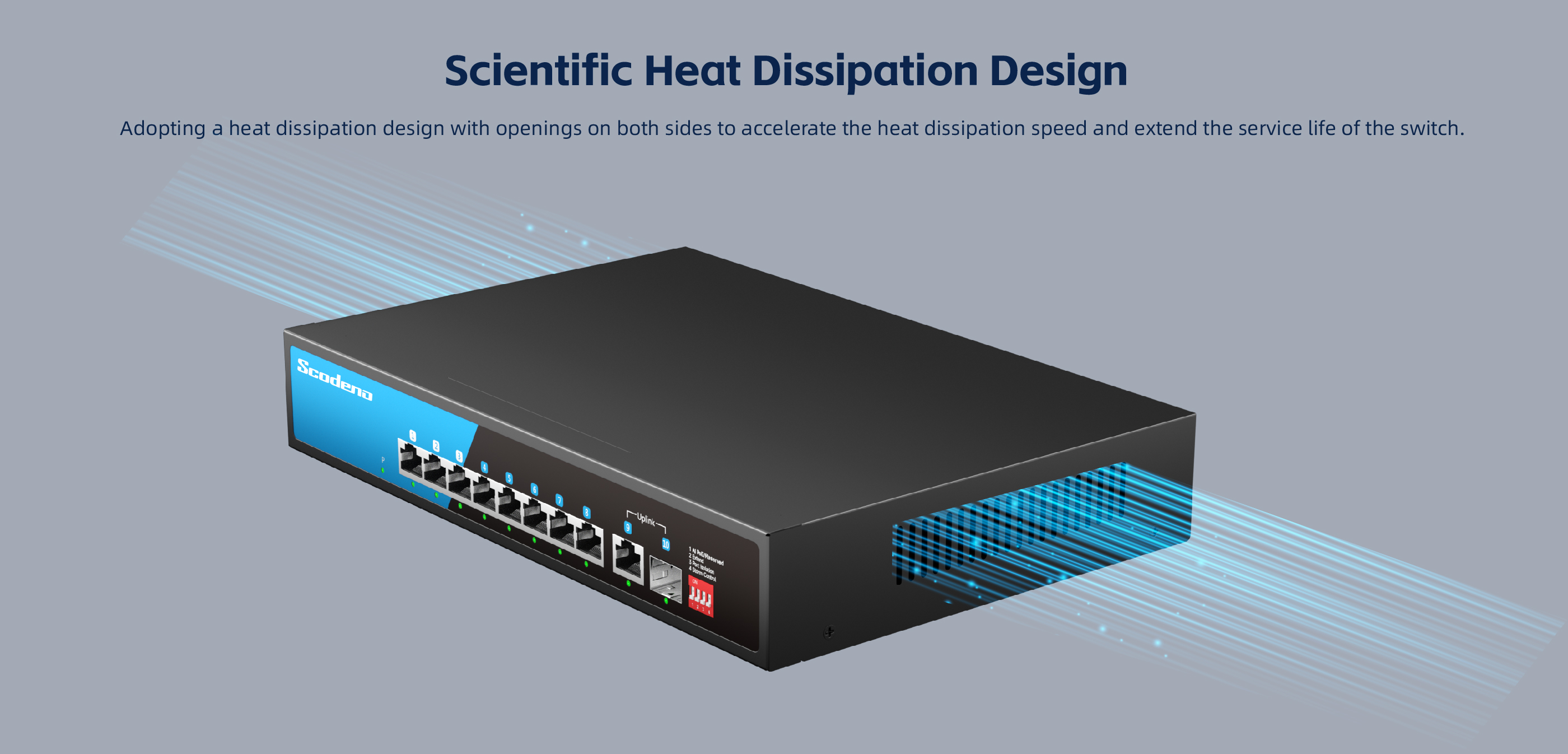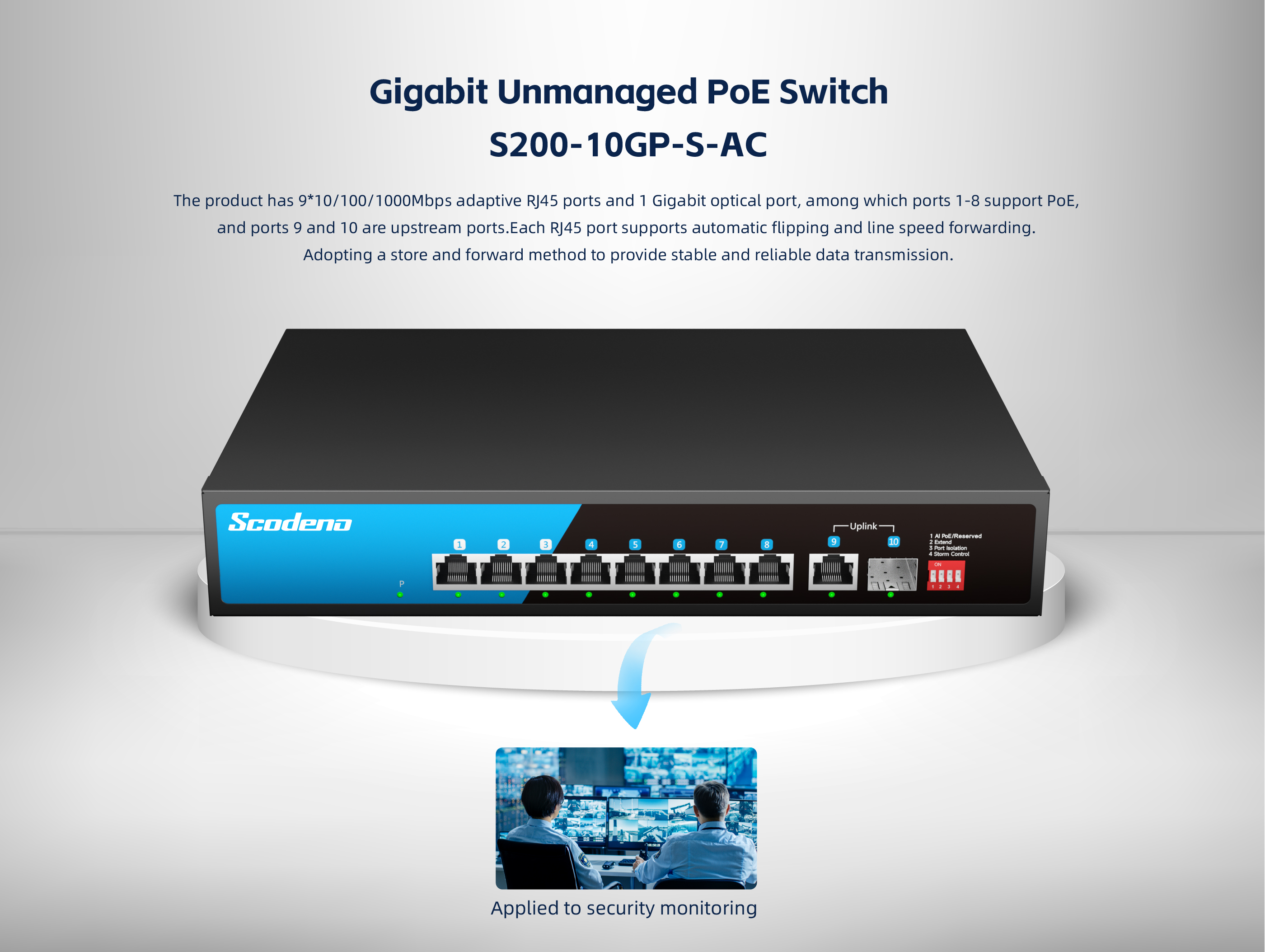 The S200-10GP-S-AC series unmanaged PoE switch has 9 10/100/1000Mbps adaptive