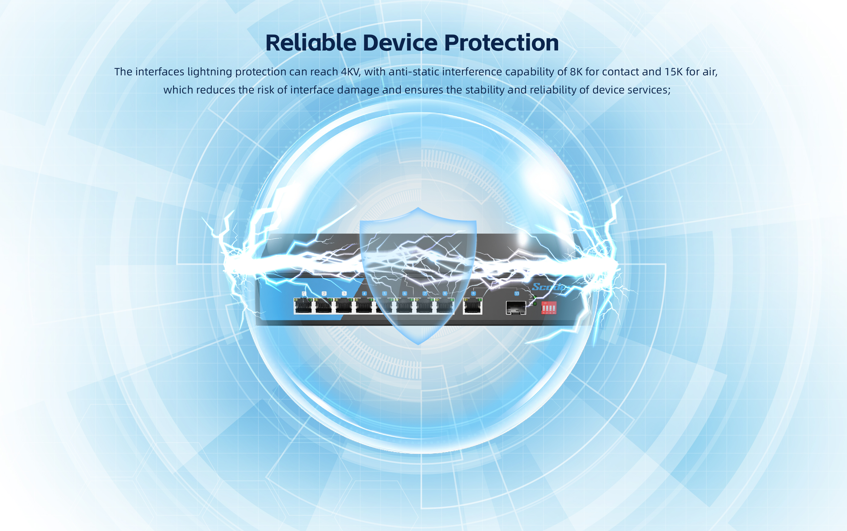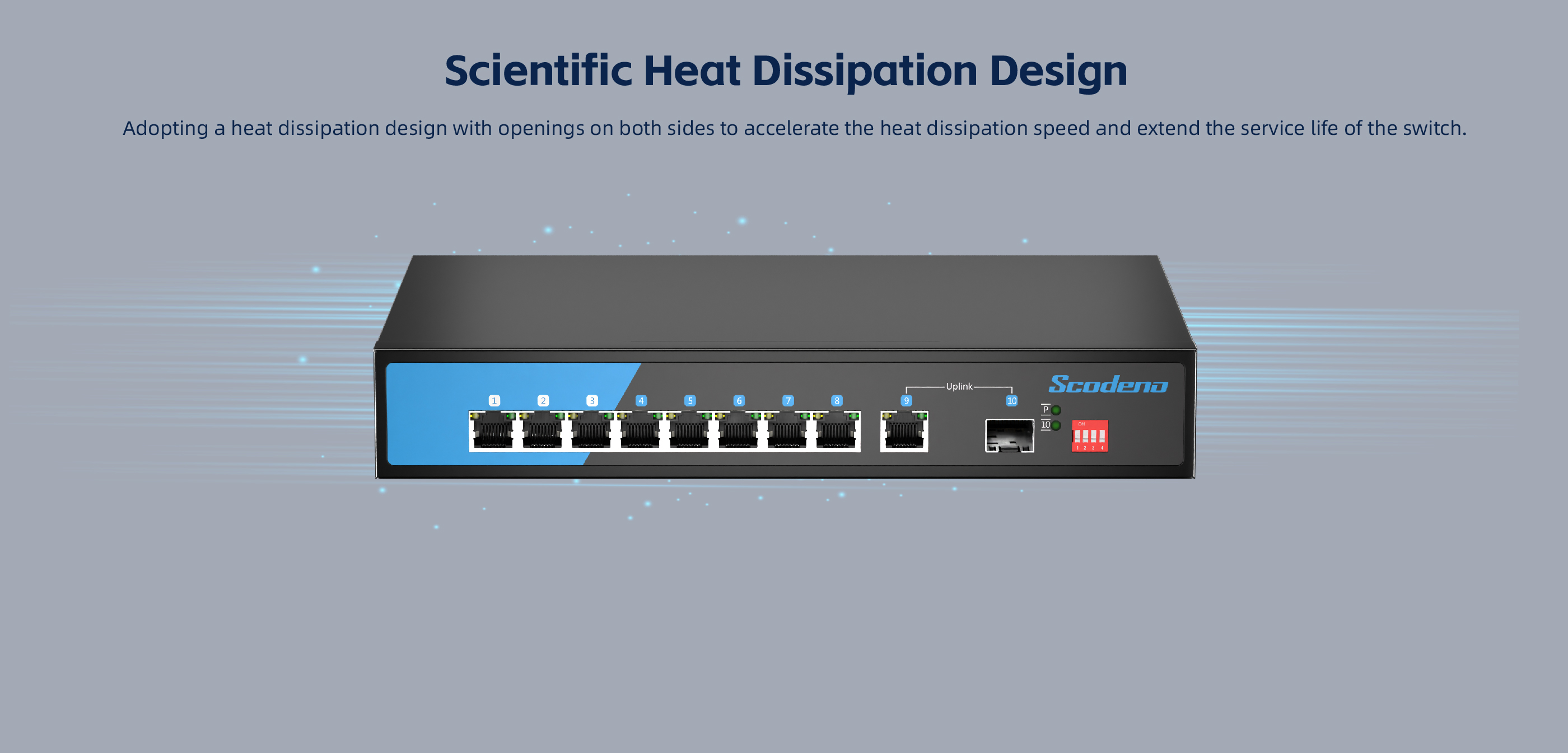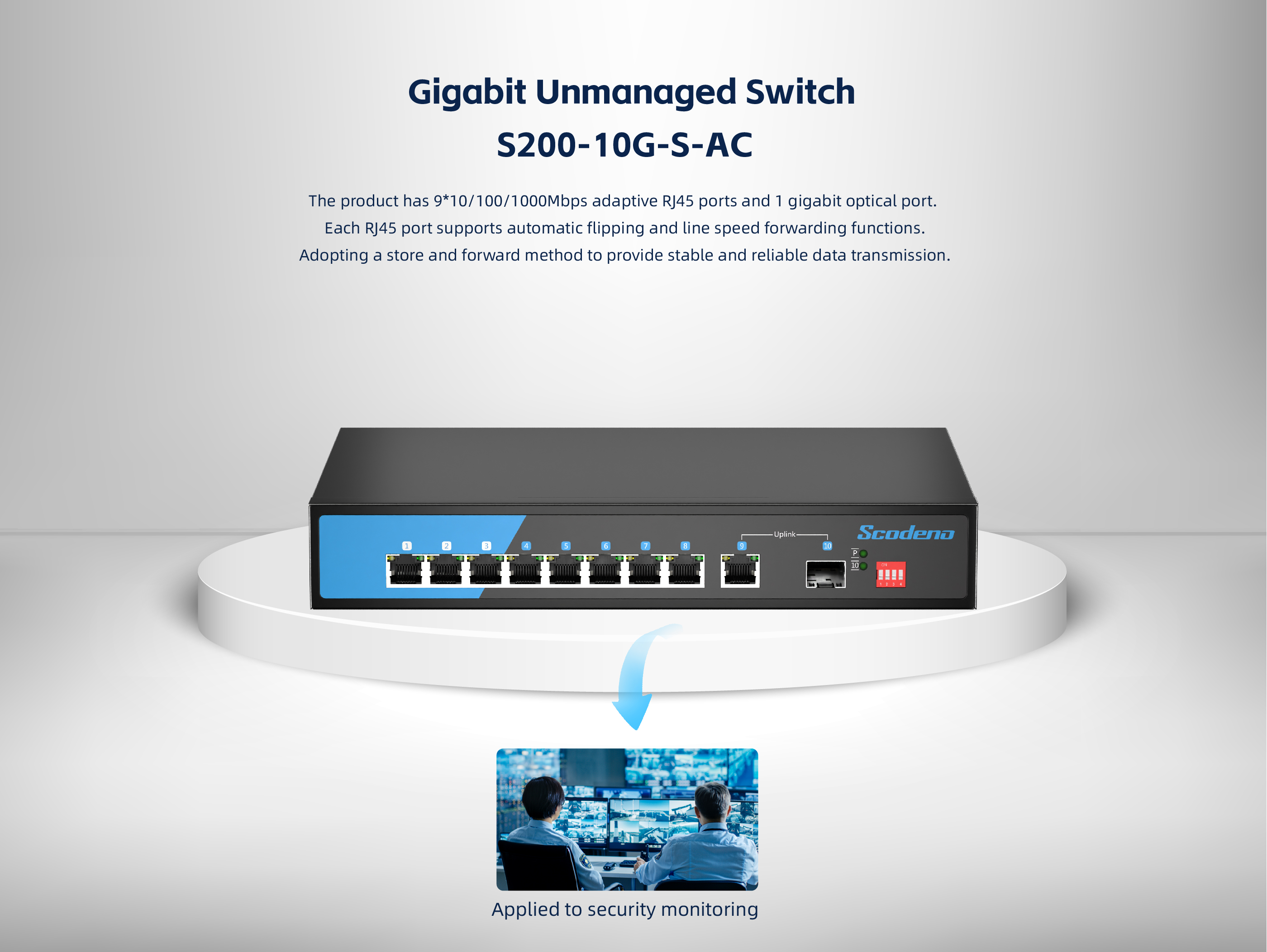 The S200-10G-S-AC series unmanaged switch has 9 10/100/1000Mbps adaptive RJ45