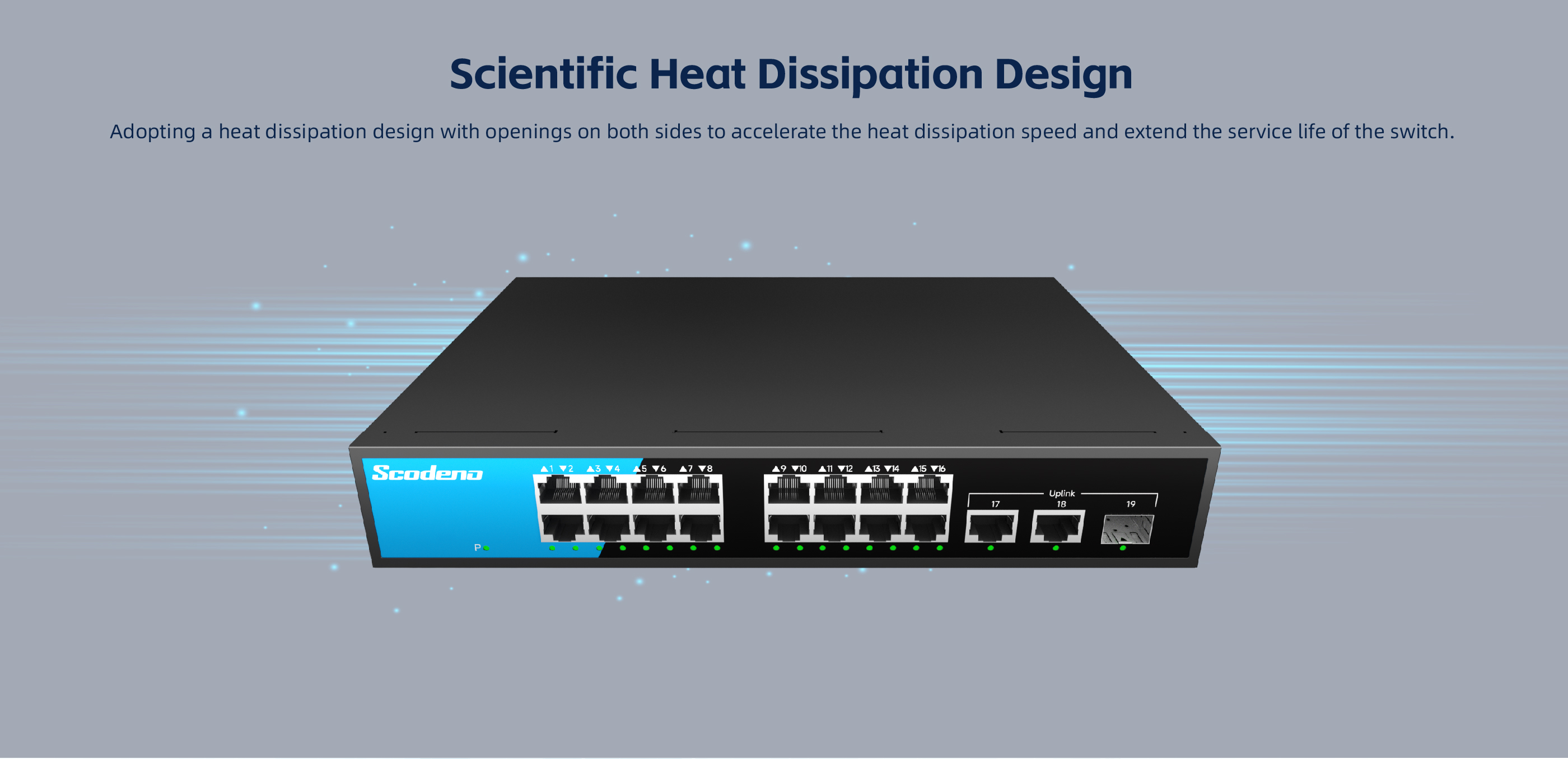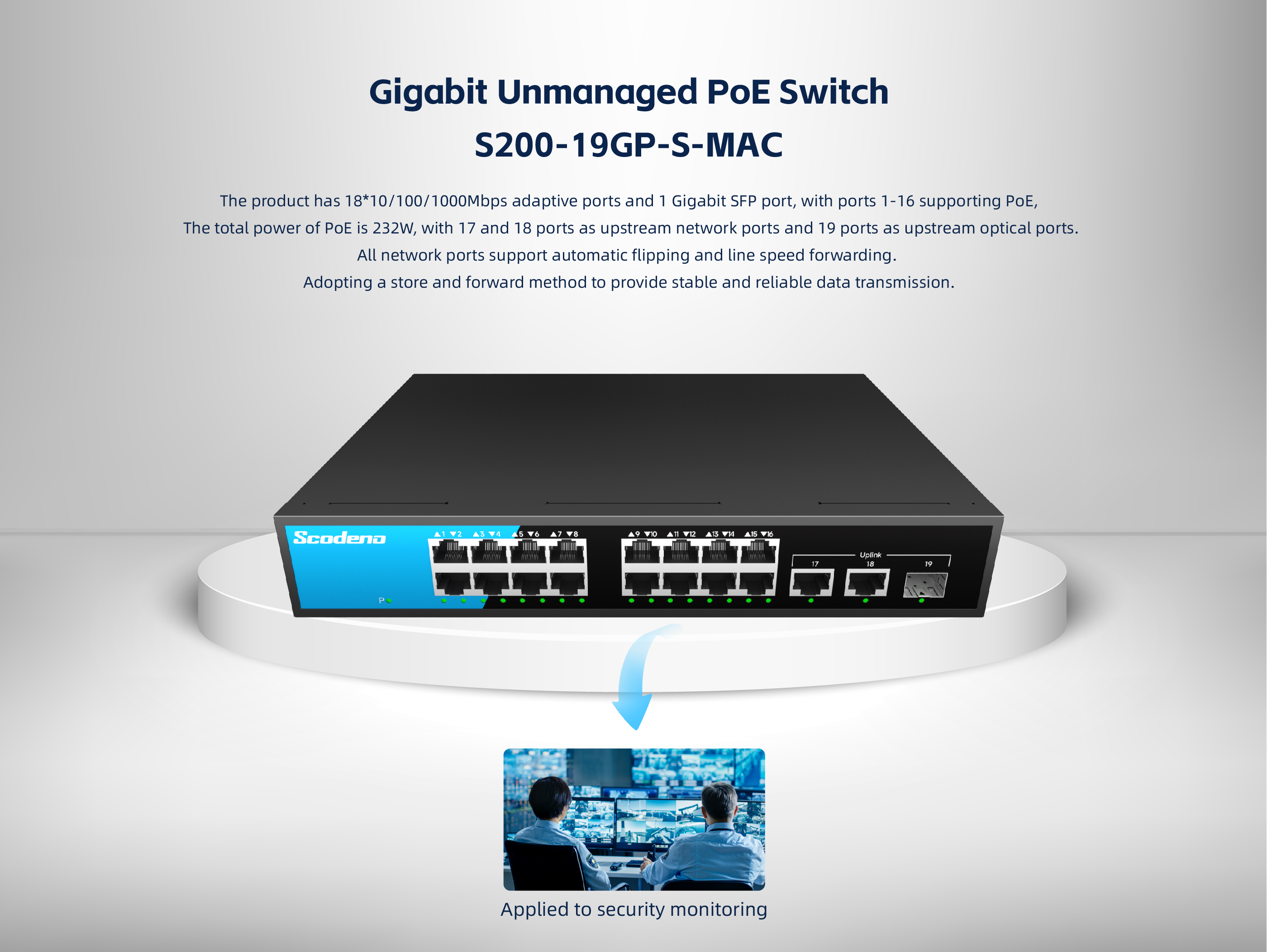 The S200-19GP-S-MAC series unmanaged PoE switch has 18 10/100/1000Mbps adap-