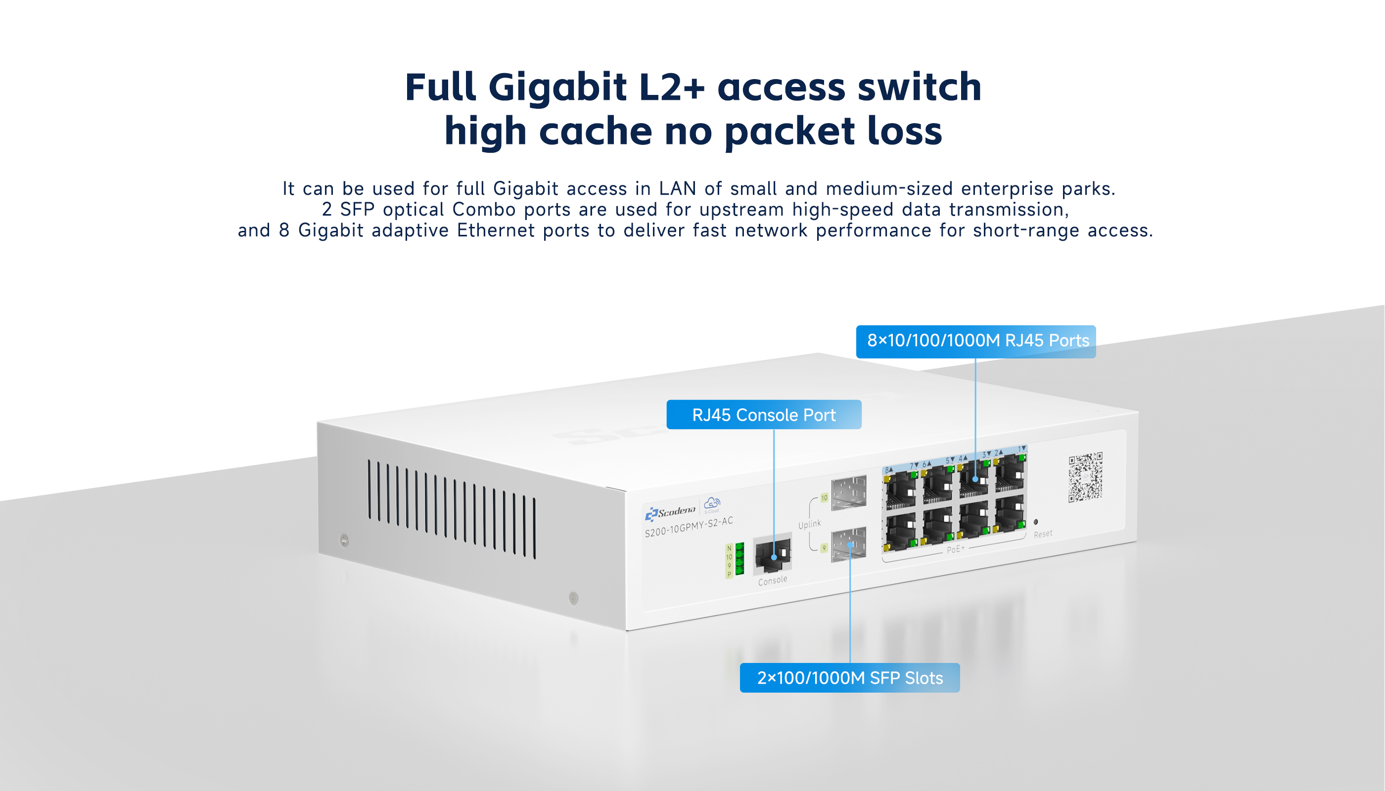 · 8*1000M RJ45 ports, 2*1000M SFP ports for uplink,4MB cache.