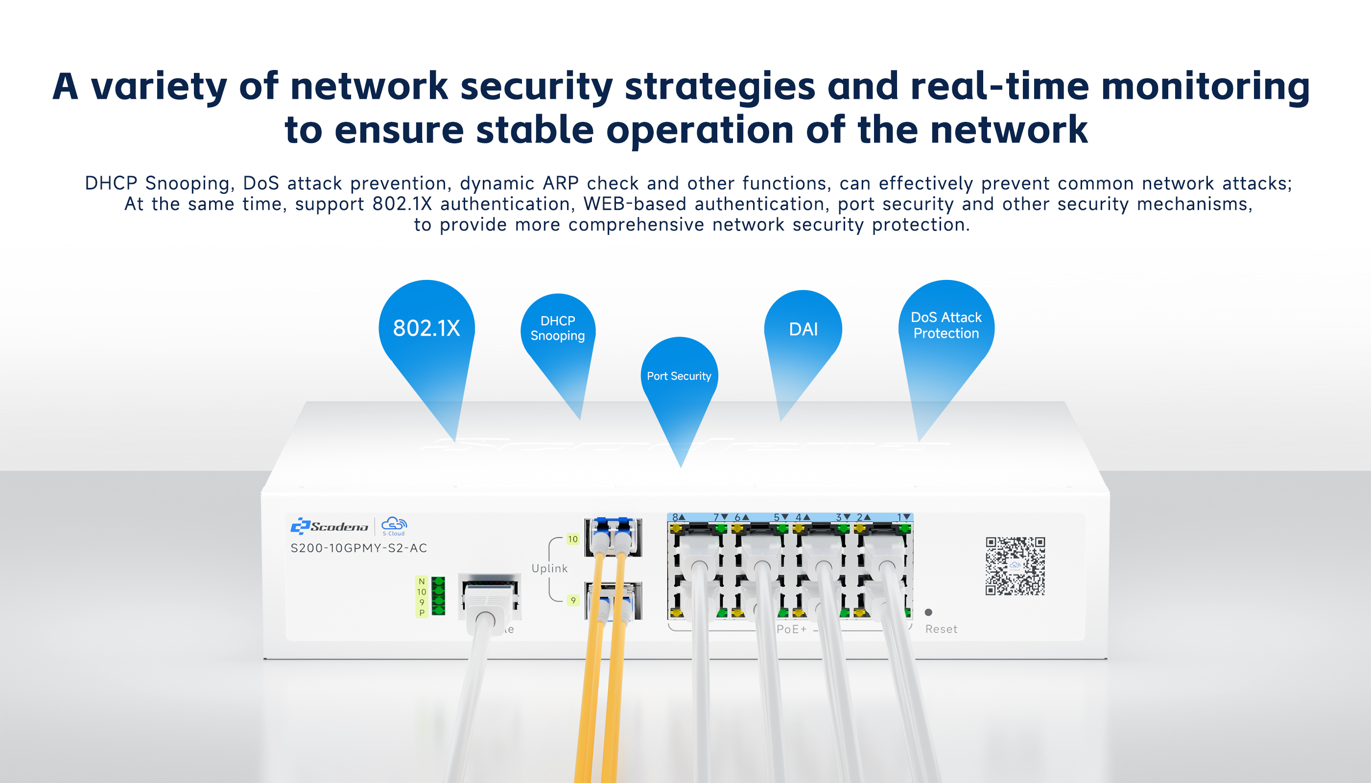 S200-10GPMY-S2-AC supports 8*10/100/1000Mbps adaptive RJ45 ports and 2*SFP optical Combo interfaces. Each RJ45 port supports auto-port switching and line-rate forwarding, complying with IEEE 802.3af/at standards. Maximum single-port power is 30W. Utilizing store-and-forward technology with QoS integration, it ensures efficient bandwidth allocation across all ports while delivering stable data transmission.The system provides multiple management options including CLI, WEB, and Cloud management, providing intuitive operation and simplified maintenance processes.