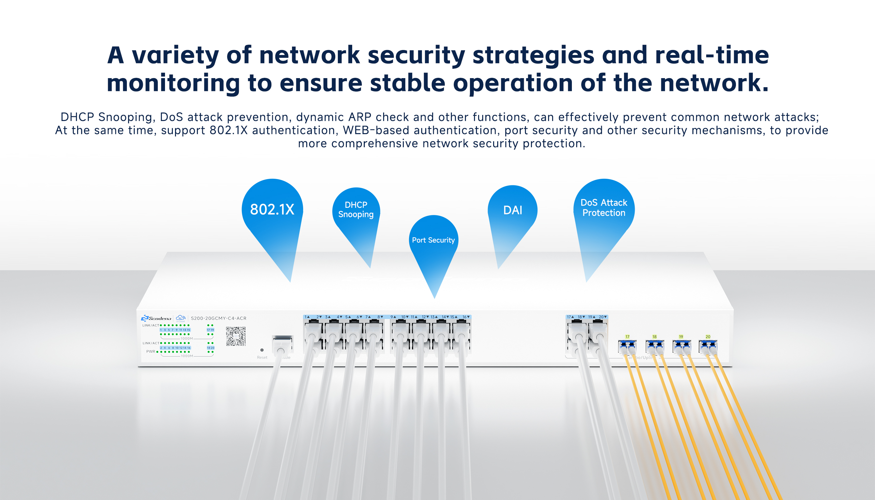 S200-20GCMY-C4-ACR features 16 adaptive RJ45 ports (10/100/1000Mbps) and 4 1000M Combo interfaces. Each RJ45 port supports auto-port switching and line-rate forwarding capabilities. Utilizing store-and-forward technology with QoS integration, it ensures efficient bandwidth allocation across all ports for stable data transmission. The system provides multiple management options including CLI, web interface, and cloud-based administration, delivering intuitive operation and simplified maintenance.