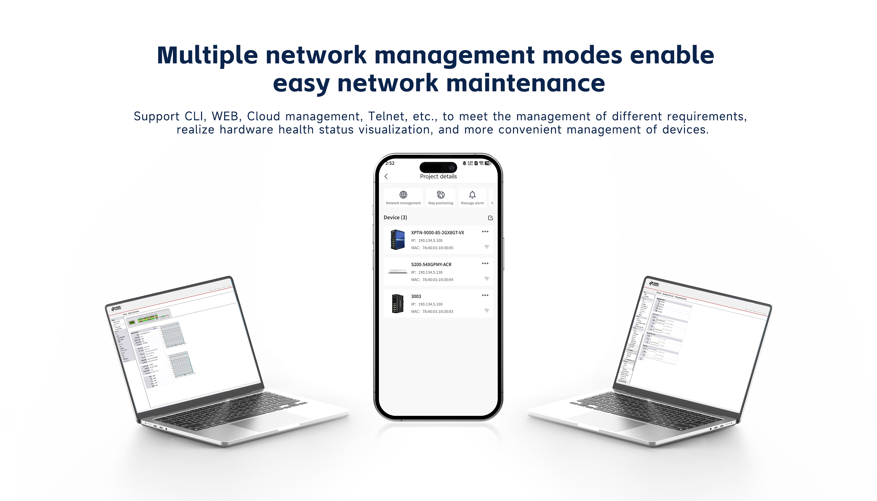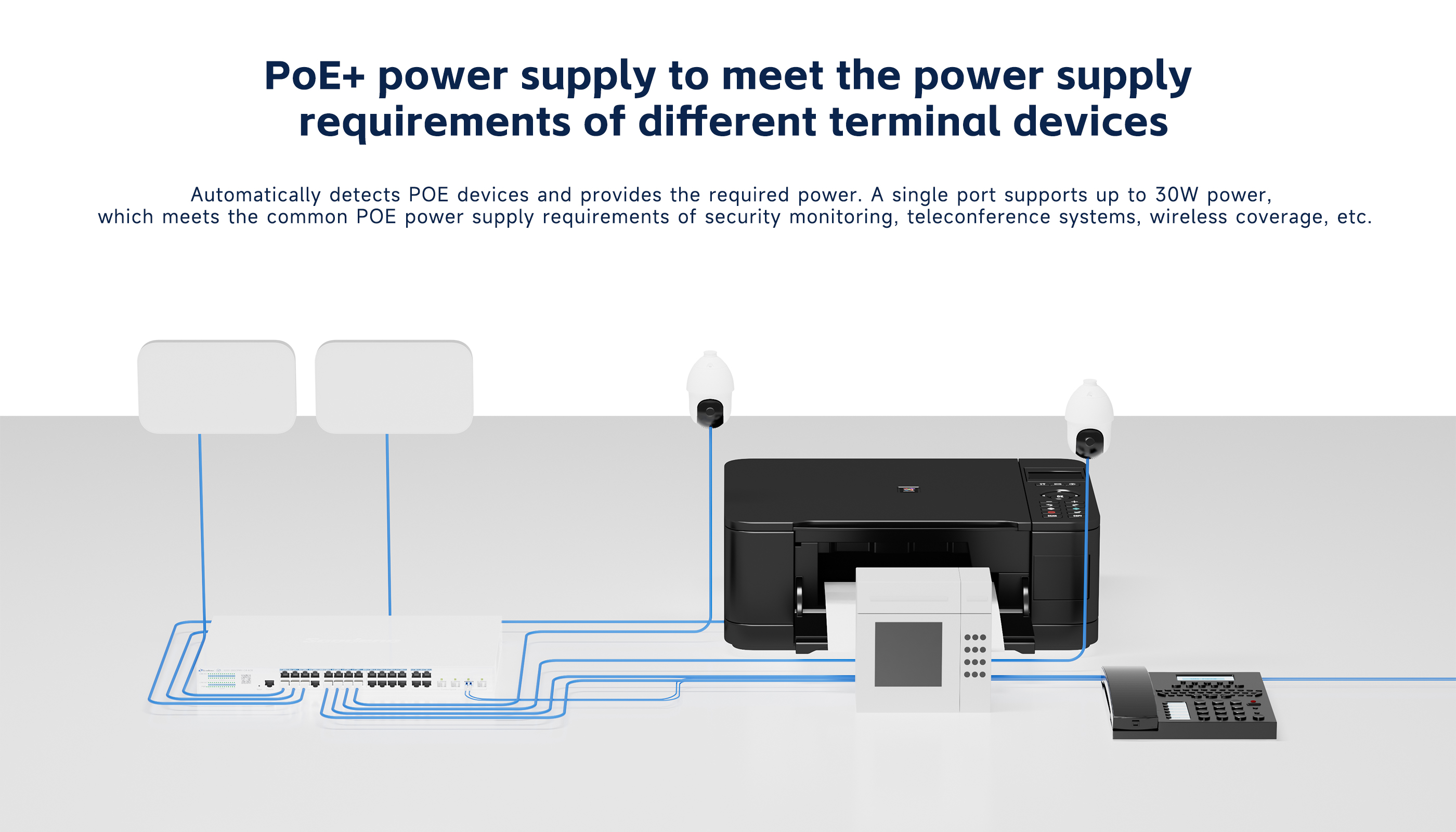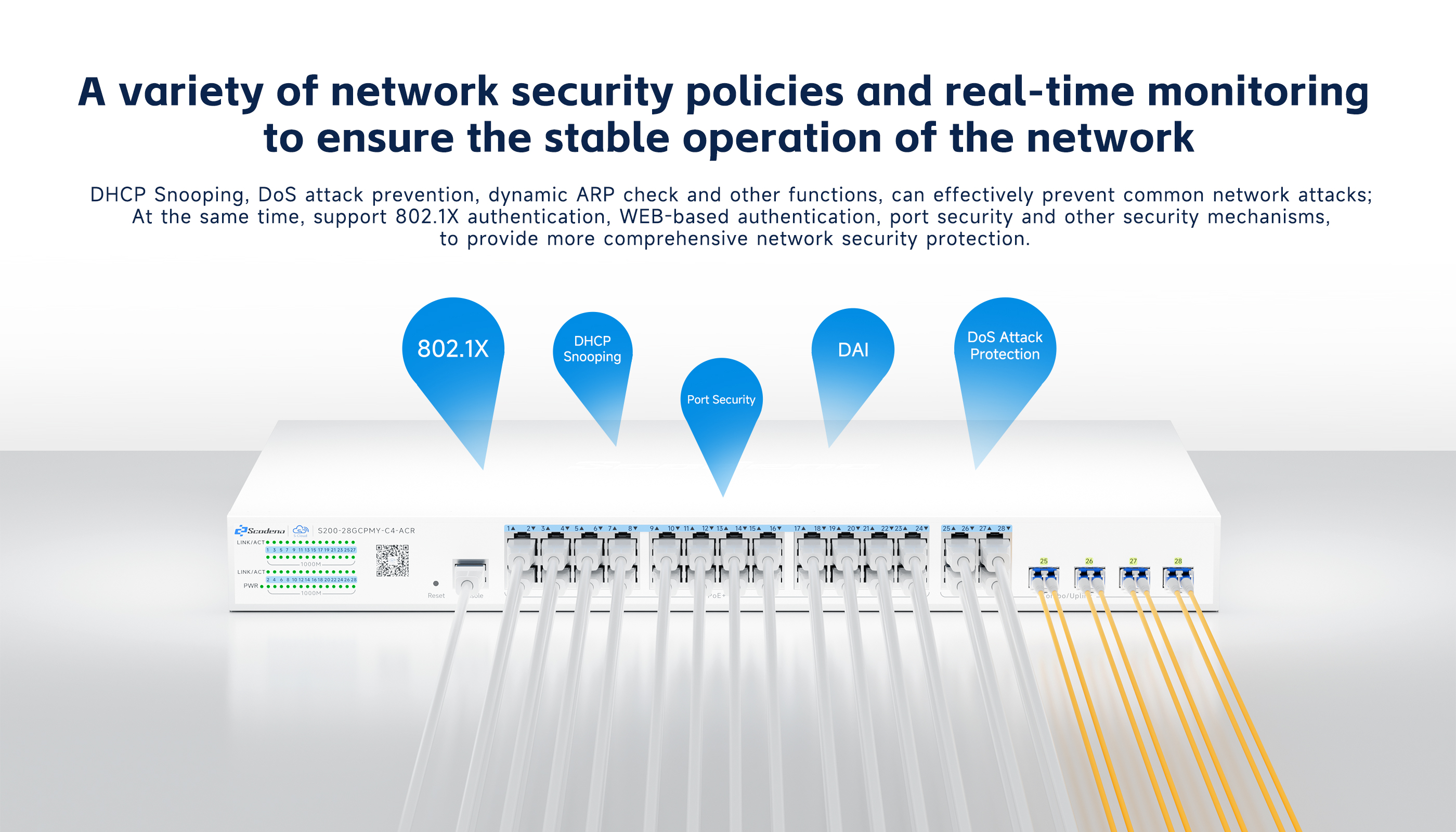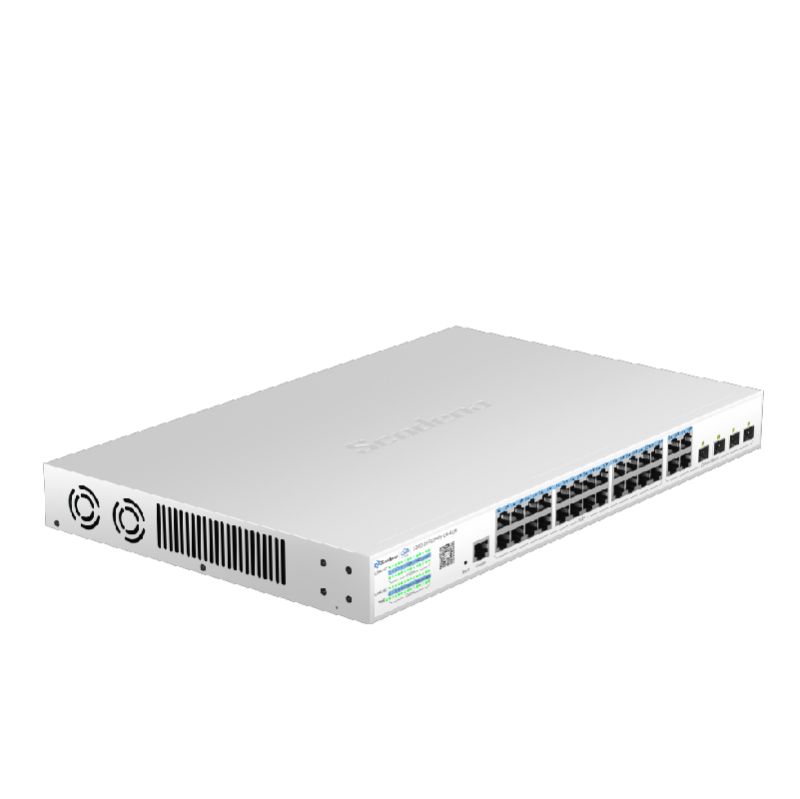S200-28GCPMY-C4-ACR supports 24*10/100/1000Mbps adaptive RJ45 ports and 4*1000M Combo interfaces. Each RJ45 port supports auto-flipping and line-rate forwarding capabilities. Compliant with IEEE 802.3af/at standards, it delivers up to 30W power per port. Utilizing store-and-forward technology with QoS integration, it ensures efficient bandwidth allocation across all ports for stable data transmission. Multiple management options including CLI, web interface, and cloud management simplify operation and maintenance.