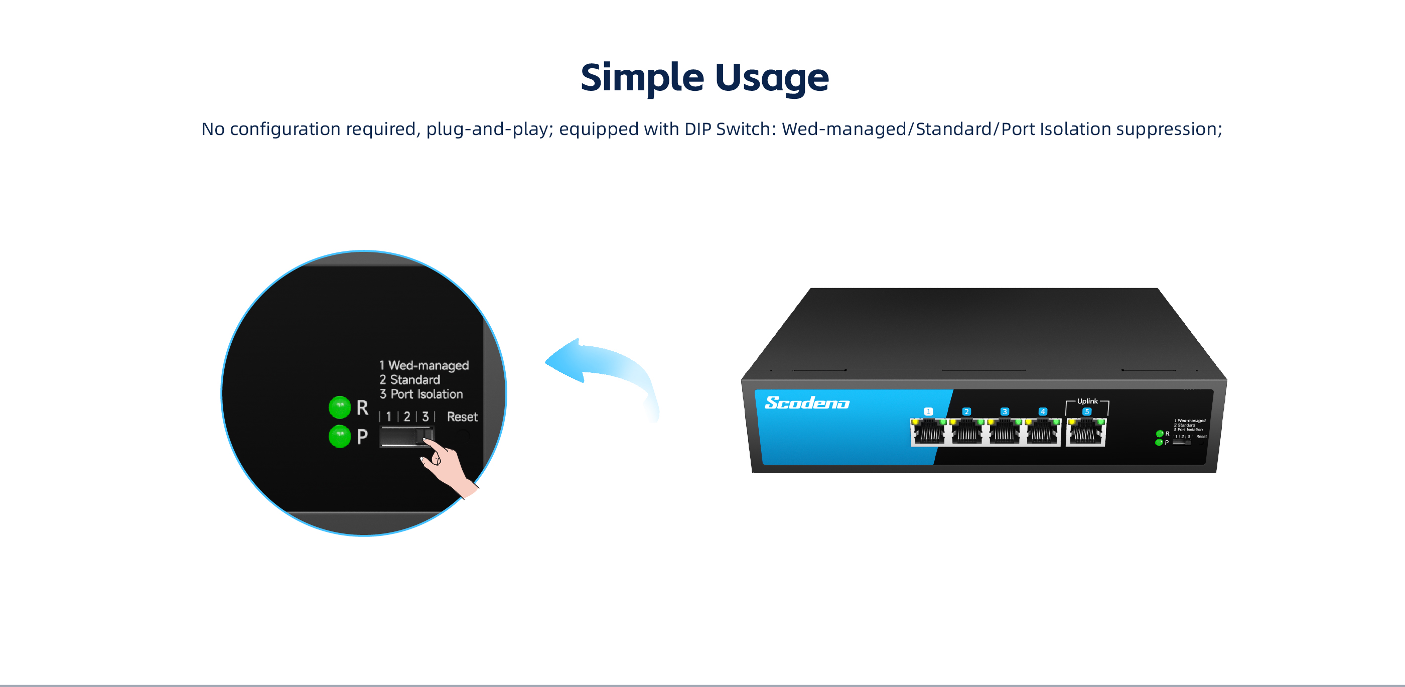 10/100/1000Mbps adaptive RJ45 ports. Each RJ45 port supports automatic flipping