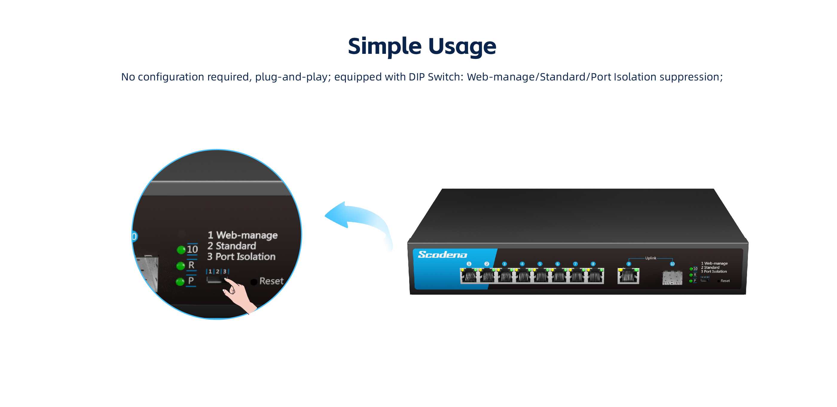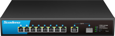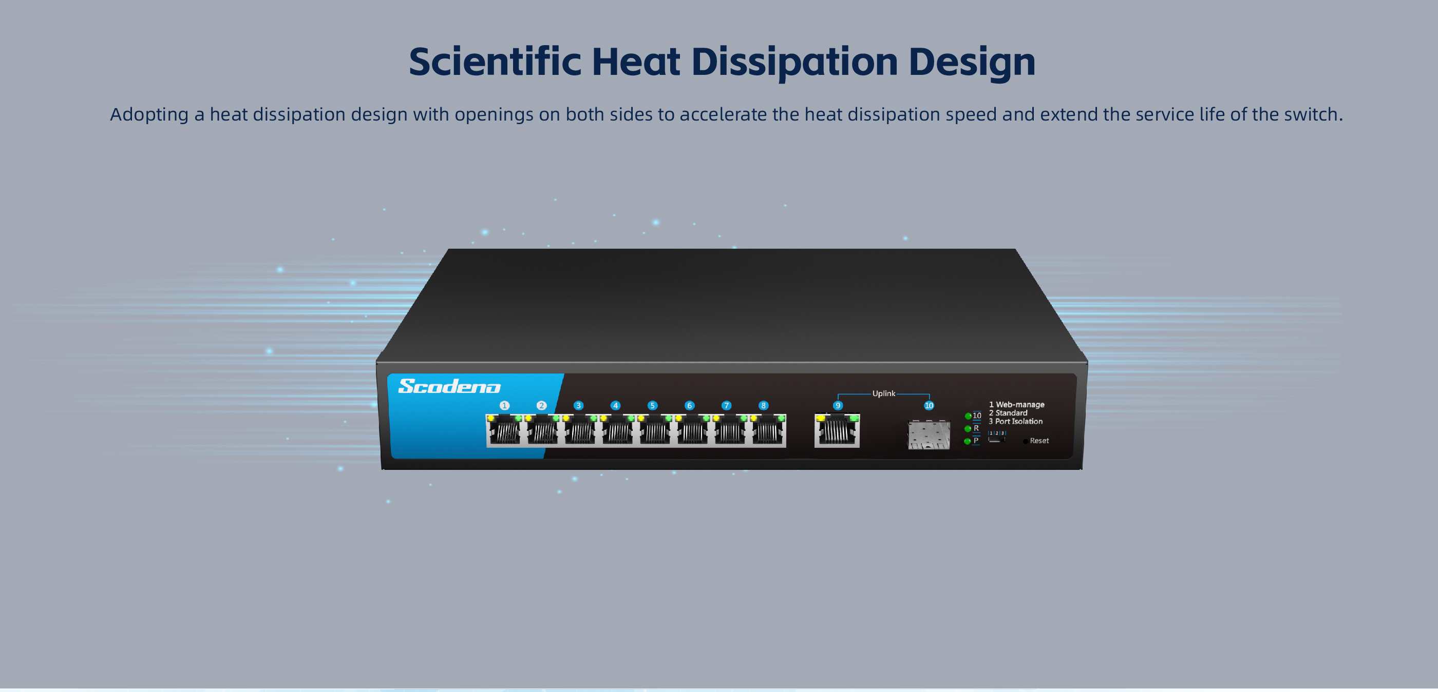 1000Mbps adaptive RJ45 ports and 1 SFP optical interface. Each RJ45 port supports automatic