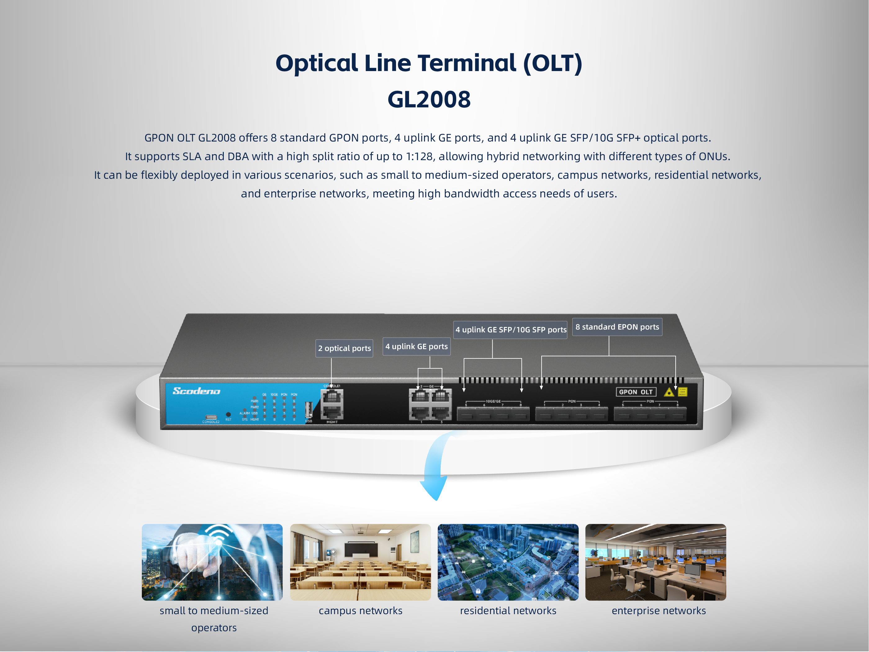 | GL2008 | 8*GPON, 4*GE port, 4* 10G SFP+ ,Dual power options available | ||