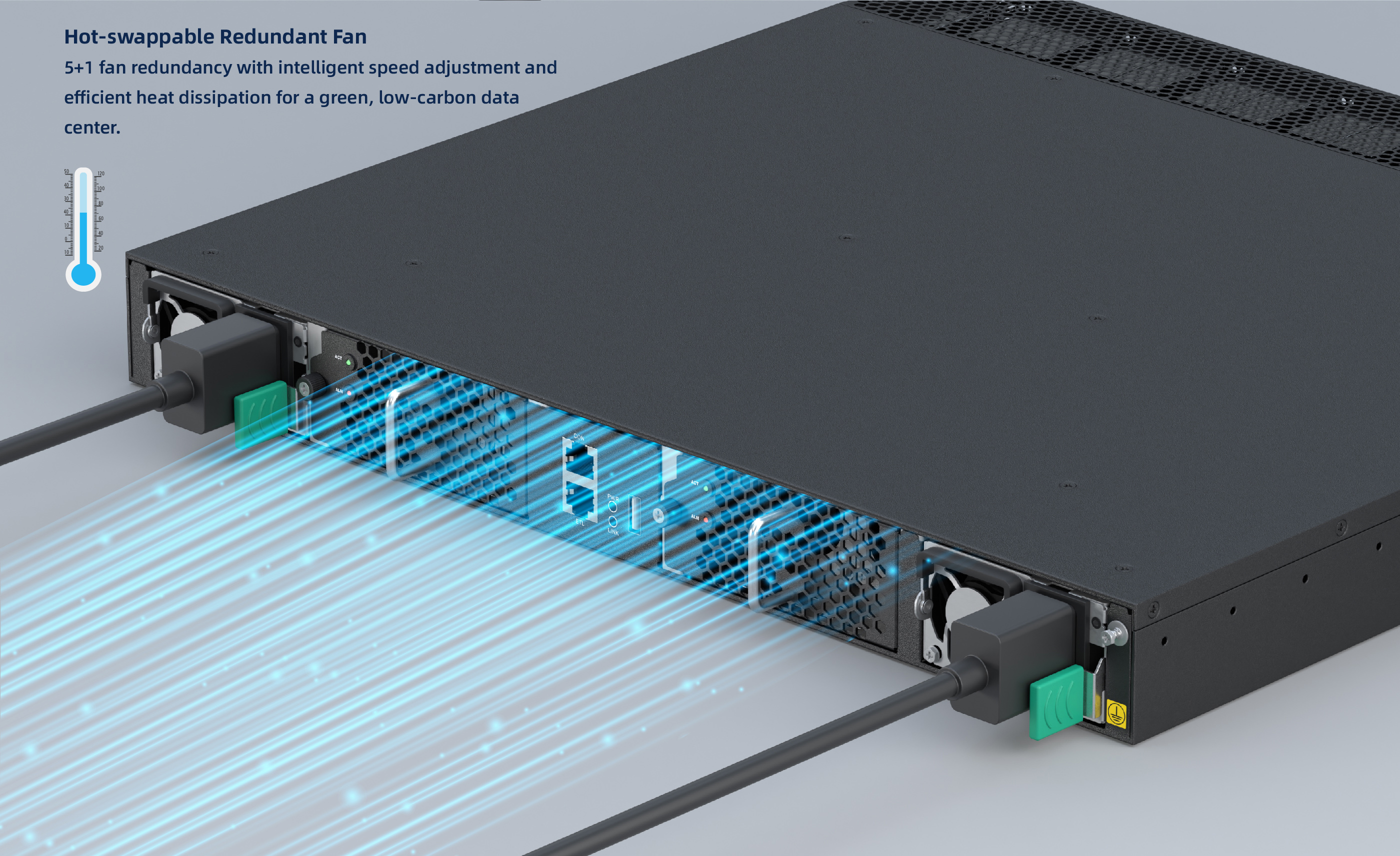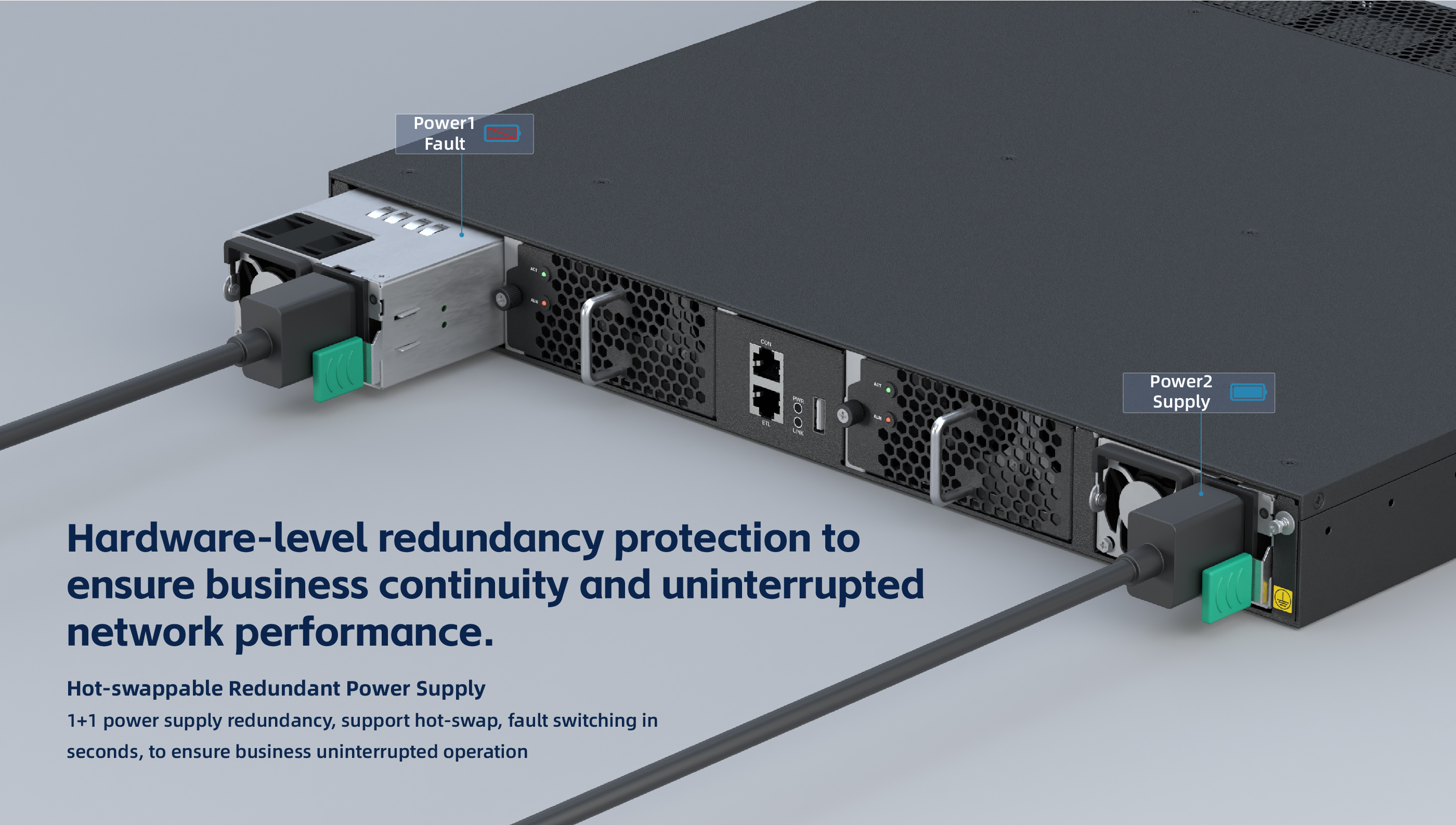 Supports 1+1 redundant heat swapping power supply, and supports simultaneous power supply from both AC and DC power sources. In addition, the switch supports fault detection and alarm for power modules and fans, and the fan speed can be automatically adjusted according to temperature changes
