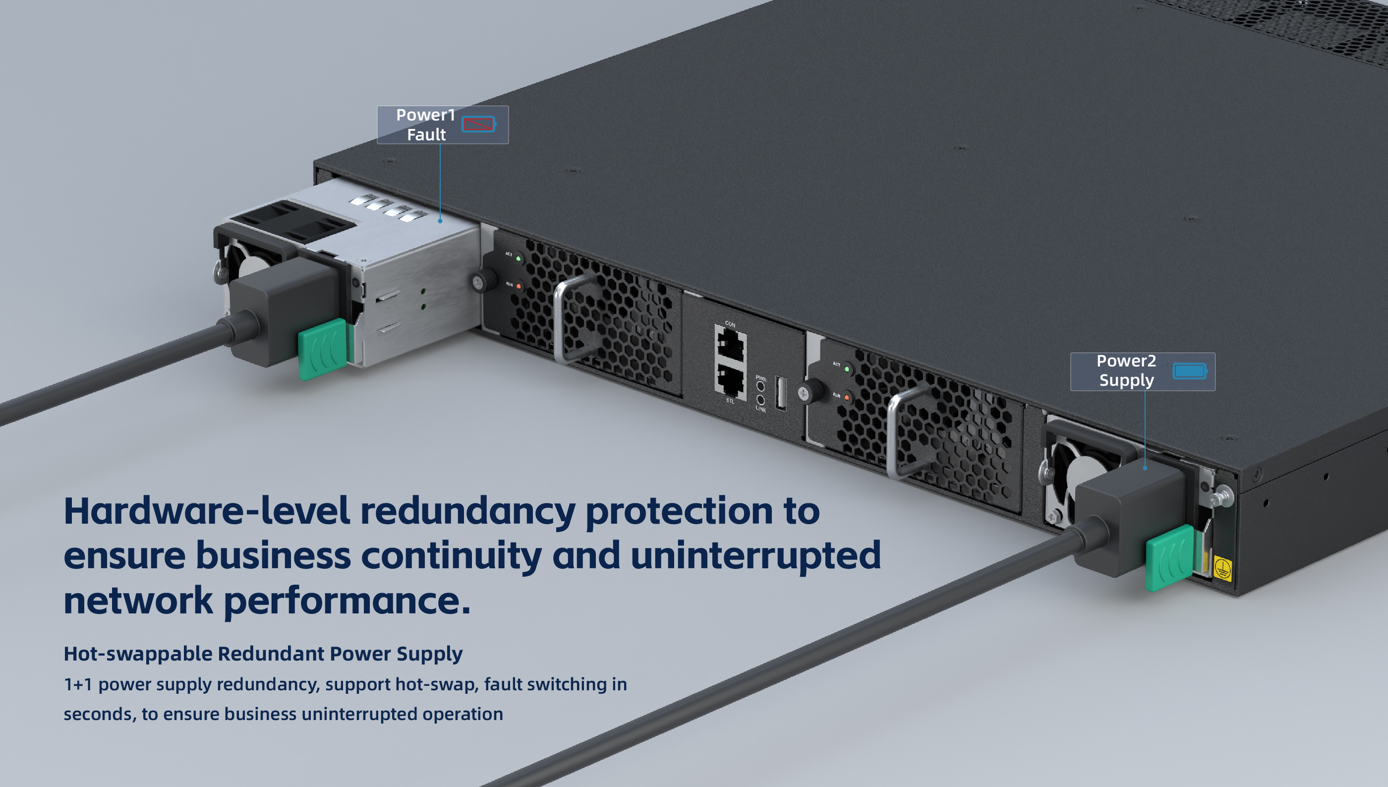 Supports 1+1 redundant heat swapping power supply, and supports simultaneous power supply from both AC and DC power sources. In addition, the switch supports fault detection and alarm for power modules and fans, and the fan speed can be automatically adjusted according to temperature changes