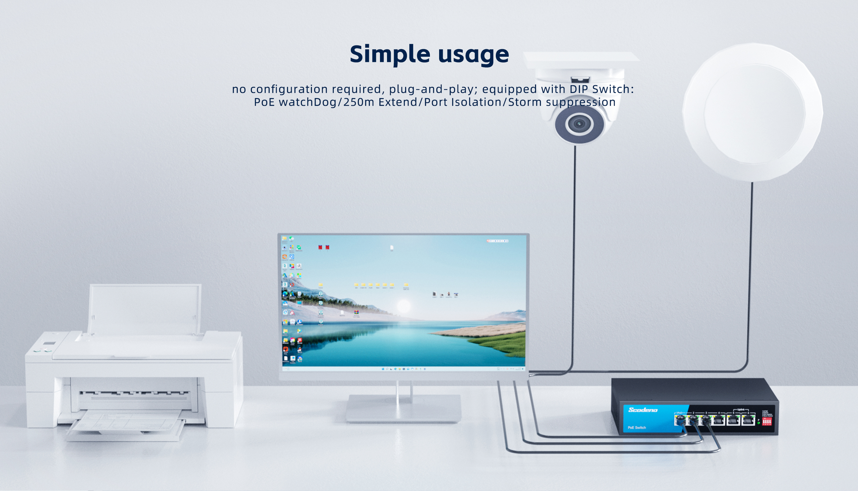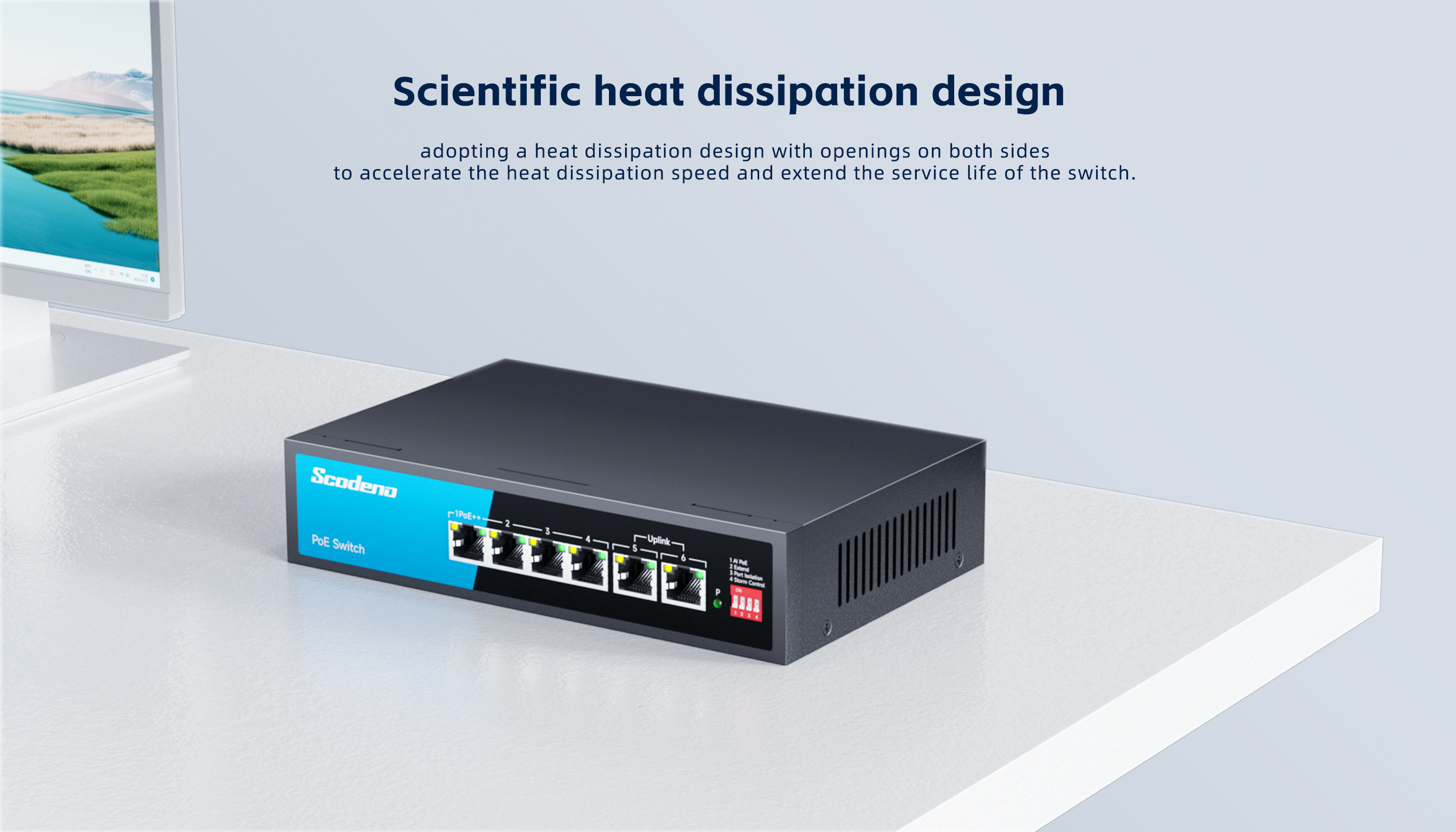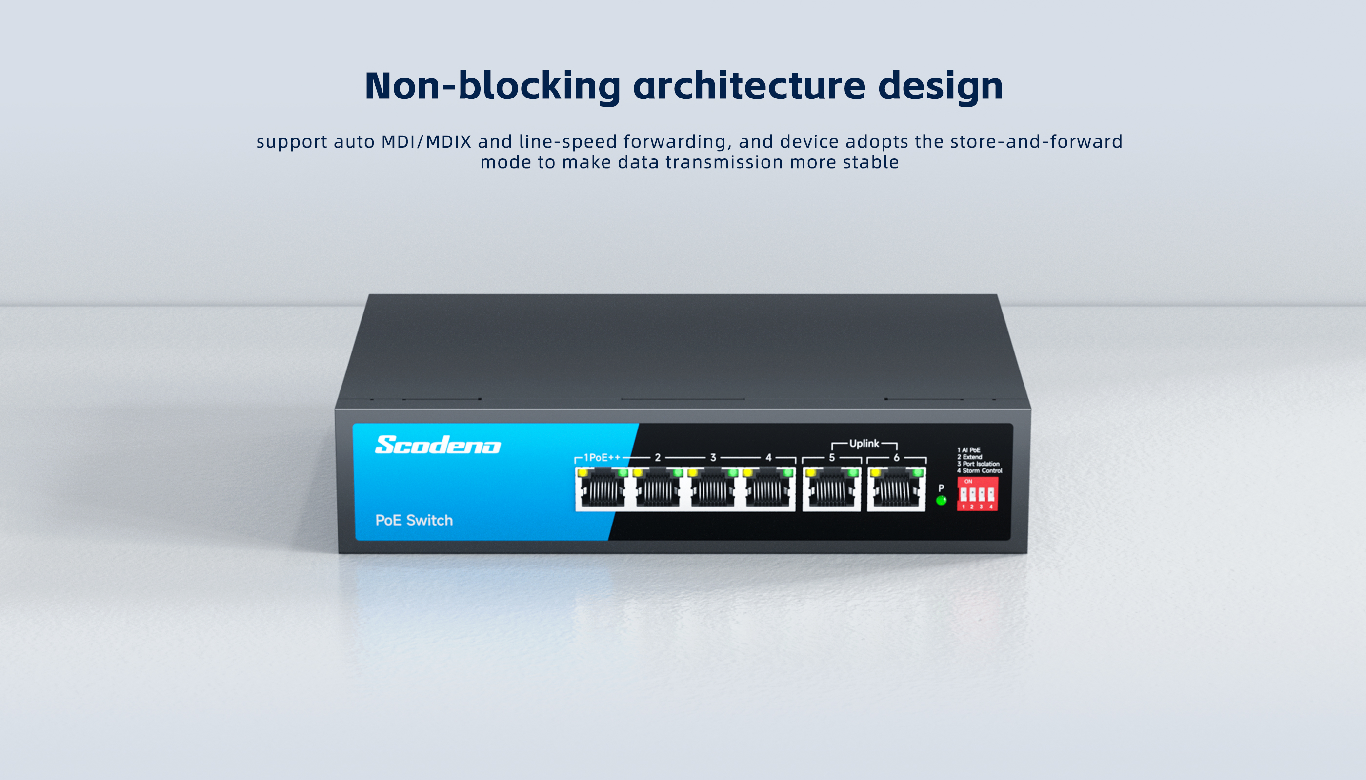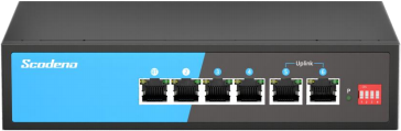The S200-6GP-B-AC series unmanaged PoE switch has 6 10/100/1000Mbps adaptive ports, of which 1-4 ports support PoE, 1 port supports BT mode (60W), and 5-6 ports are 2 Gigabit upstream network ports. All network ports support automatic flipping and line speed forwarding. Adopting a store and forward method to provide stable and reliable data transmission.