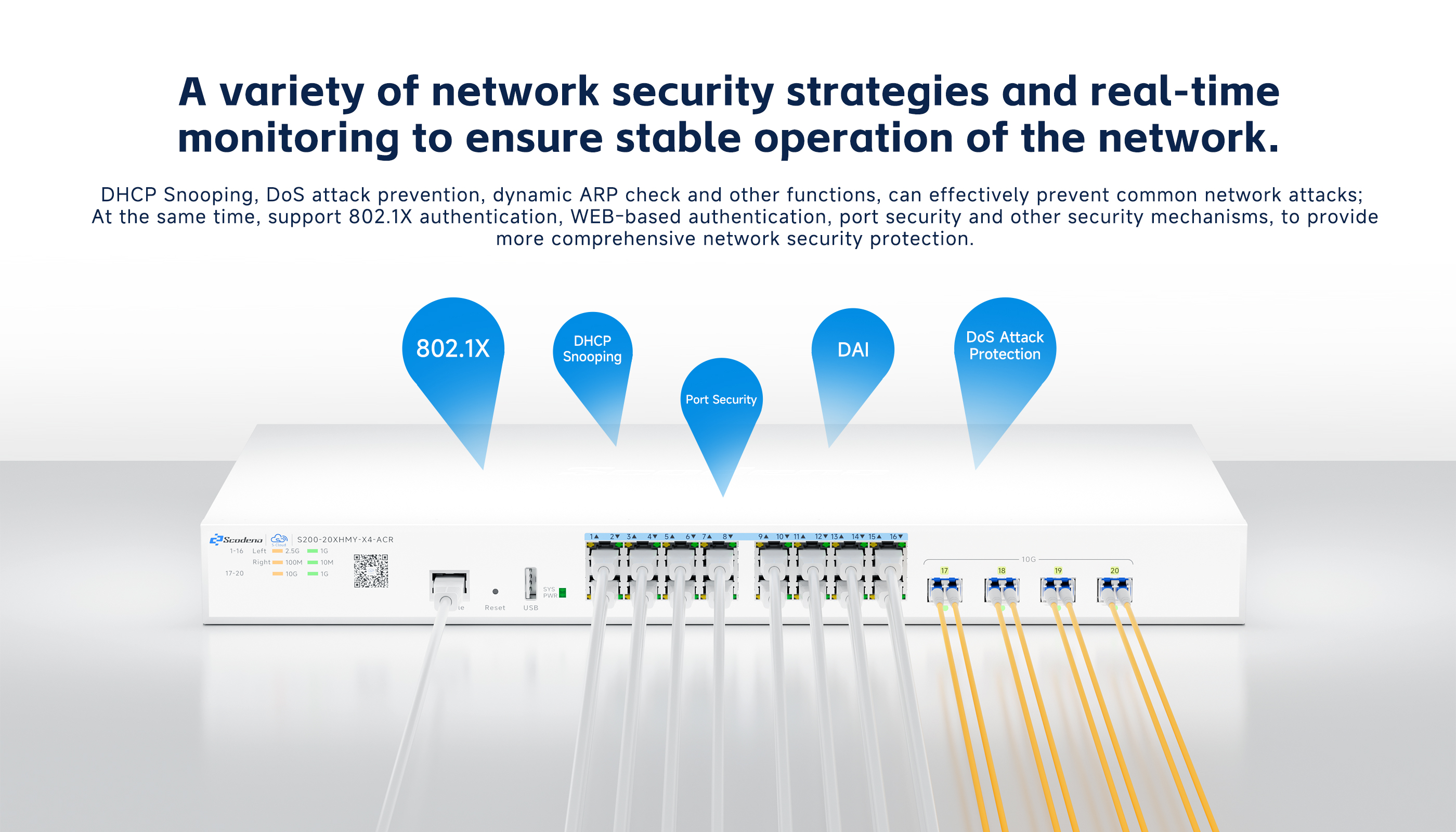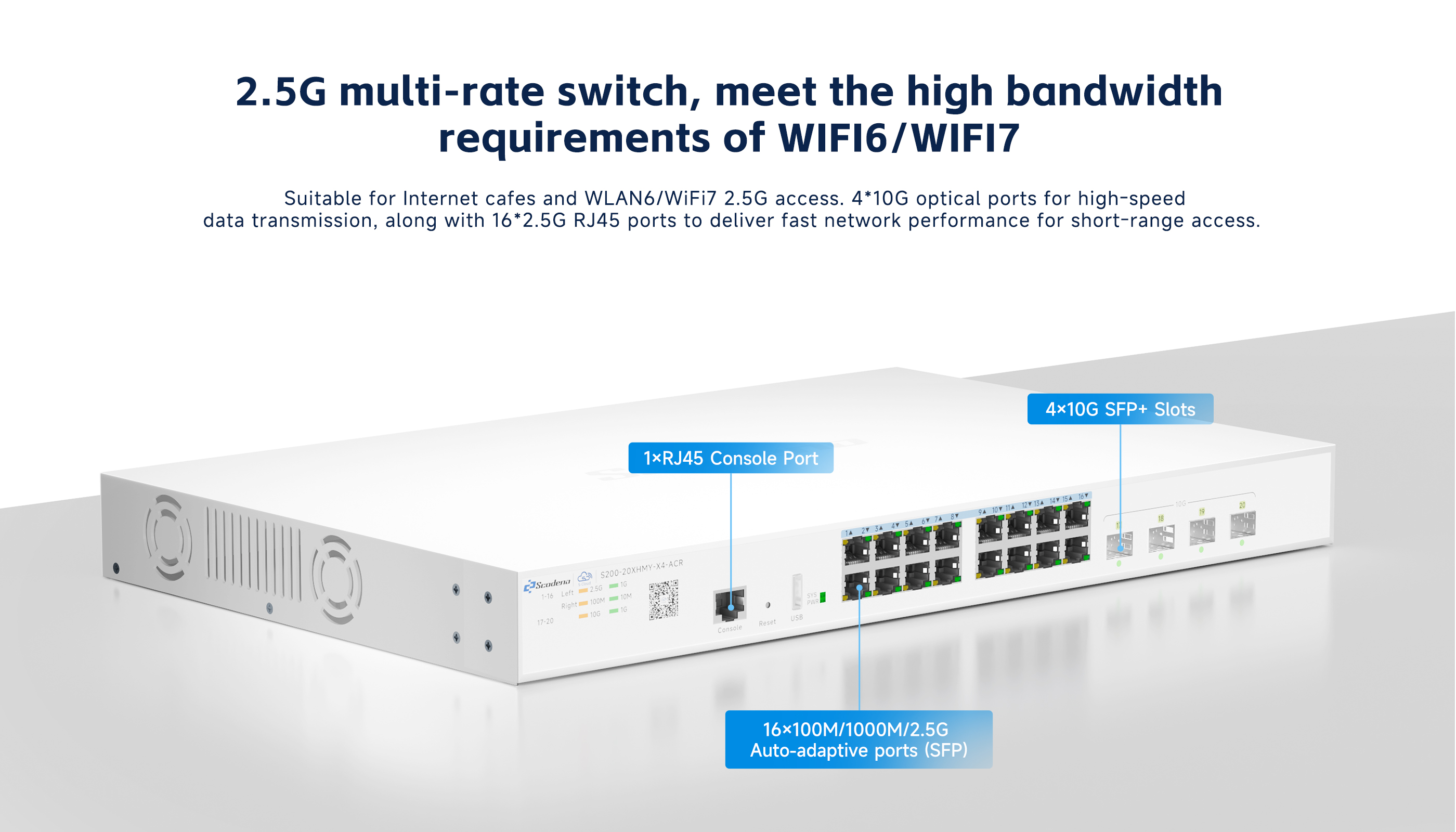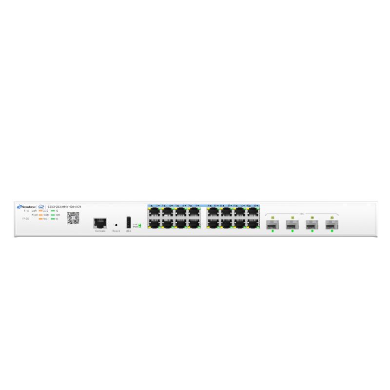 S200-20XHMY-X4-ACR supports 16*10/100/1000M/2.5G adaptive RJ45 ports and 4*10G optical uplink ports, designed for WIFI6/WIFI7 applications. Each RJ45 port supports auto-flipping and line-rate forwarding capabilities. Utilizing store-and-forward technology with QoS integration, it ensures efficient bandwidth allocation across all ports for stable data transmission. The system provides multiple management options including CLI, WEB, and Cloud management, providing intuitive operation and simplified maintenance processes.